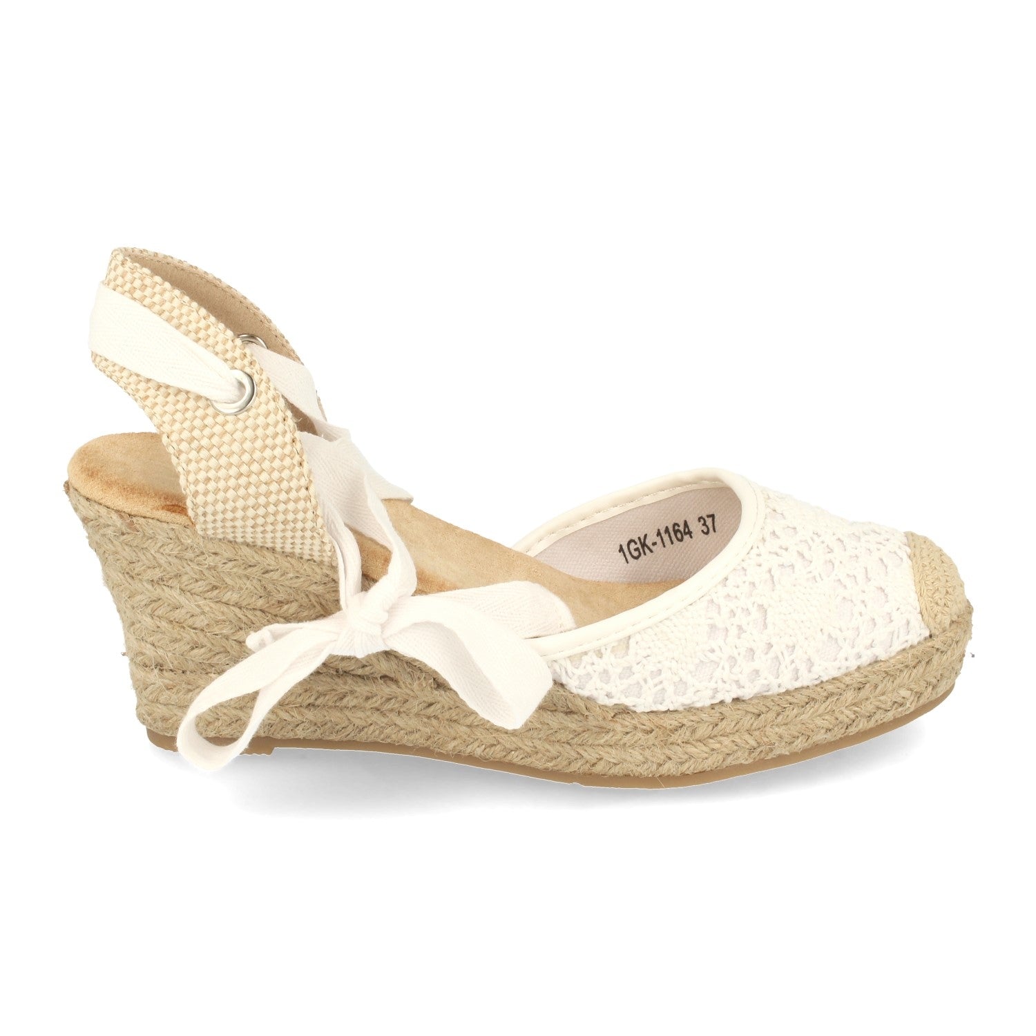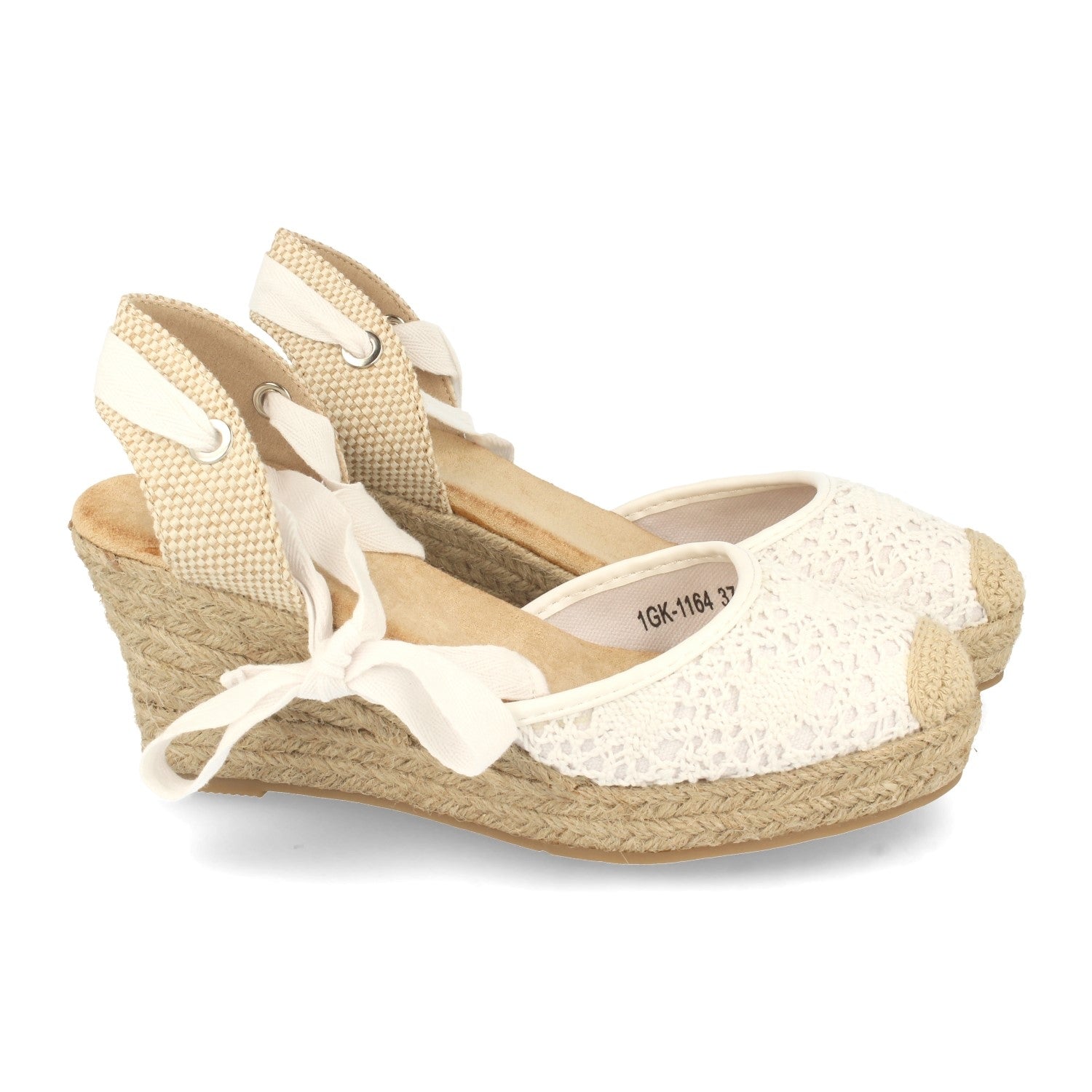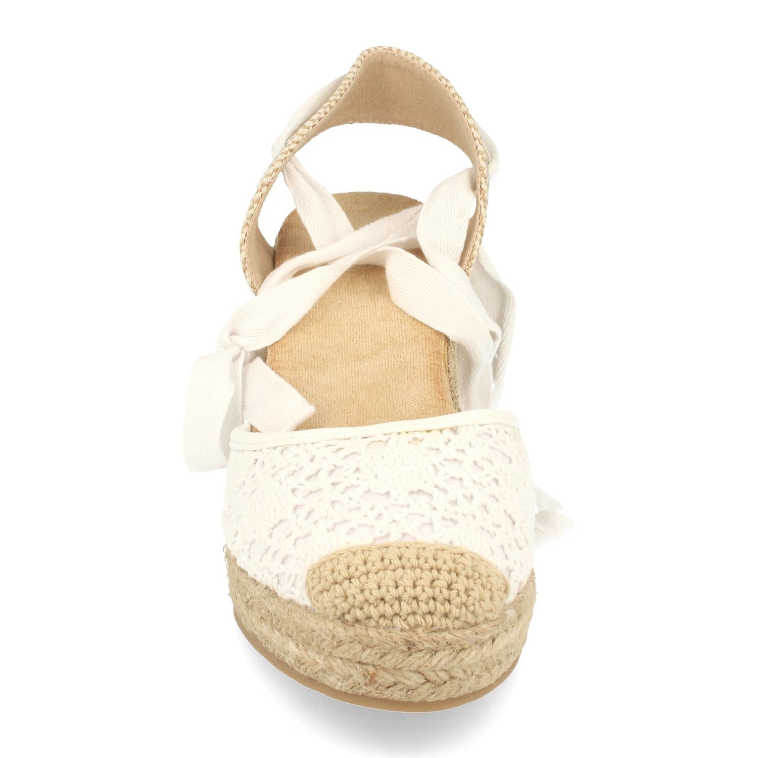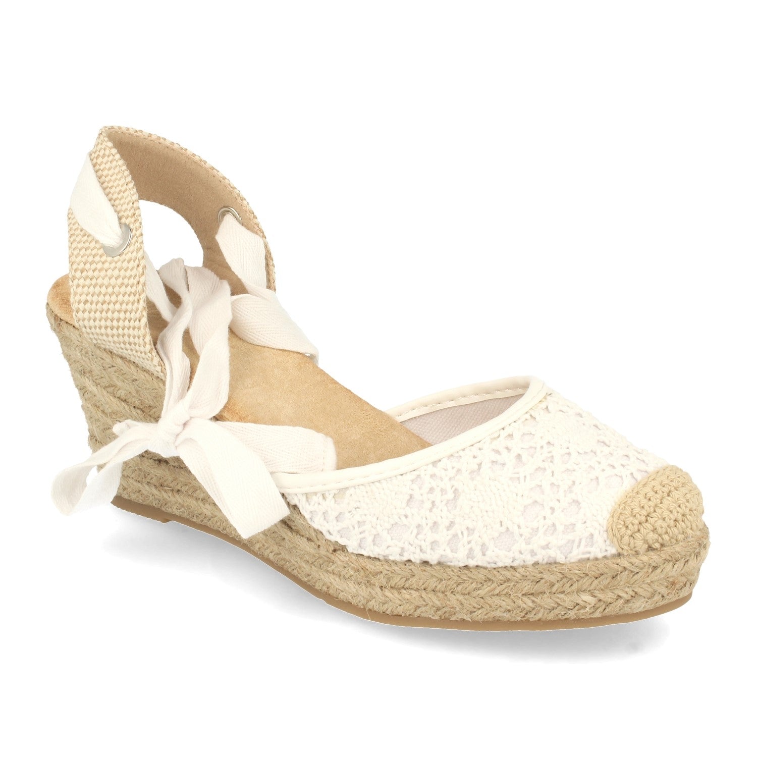 Sandalia de cuña en yute atada al tobillo con cinta. Bordado de punto.