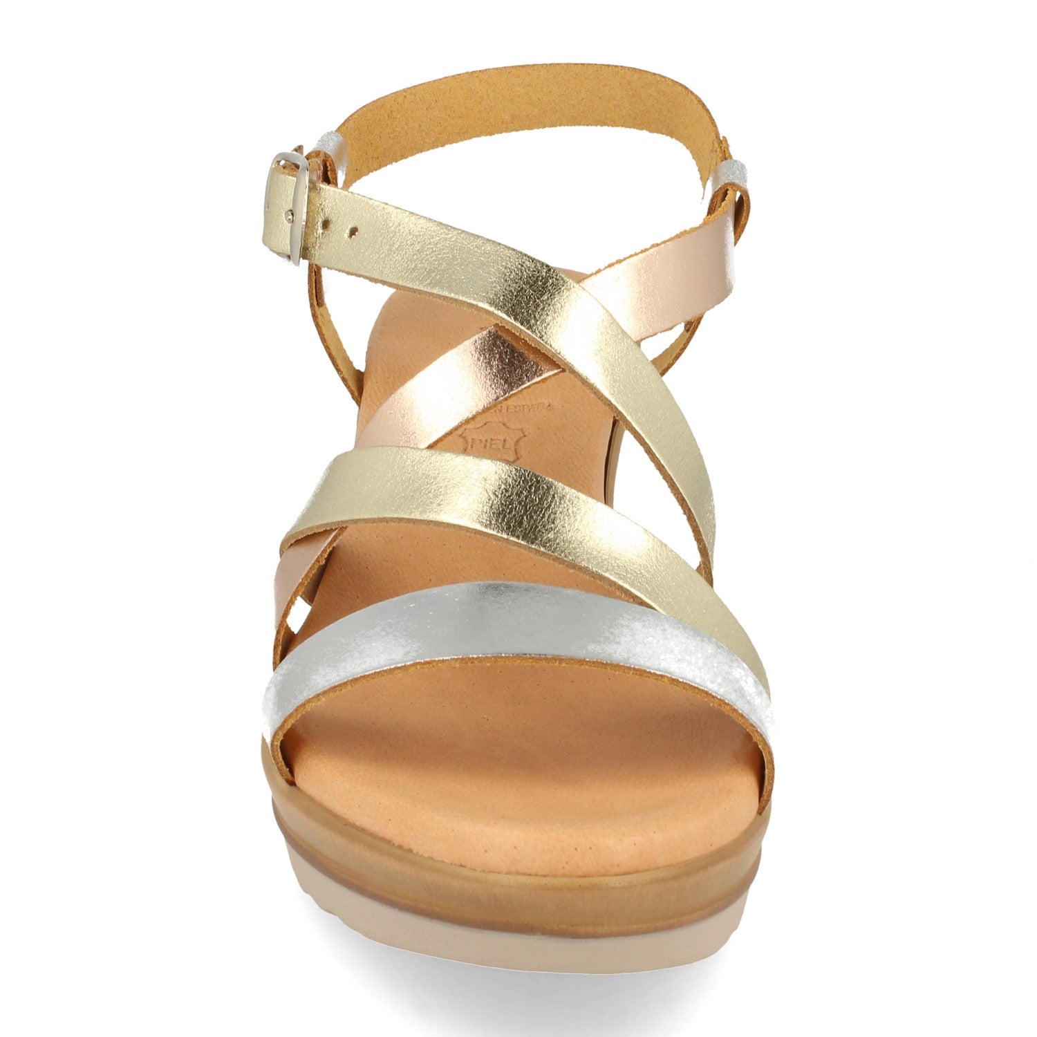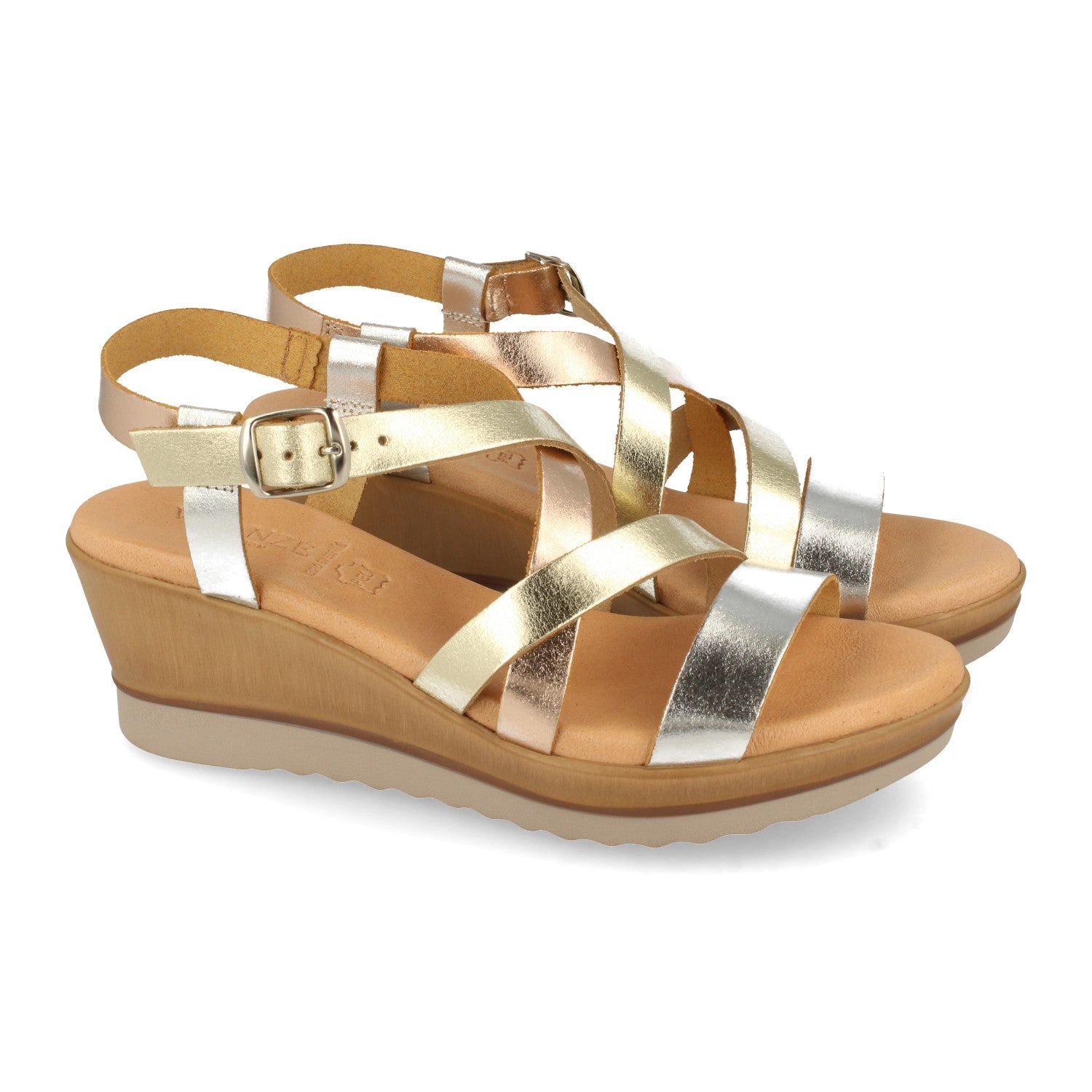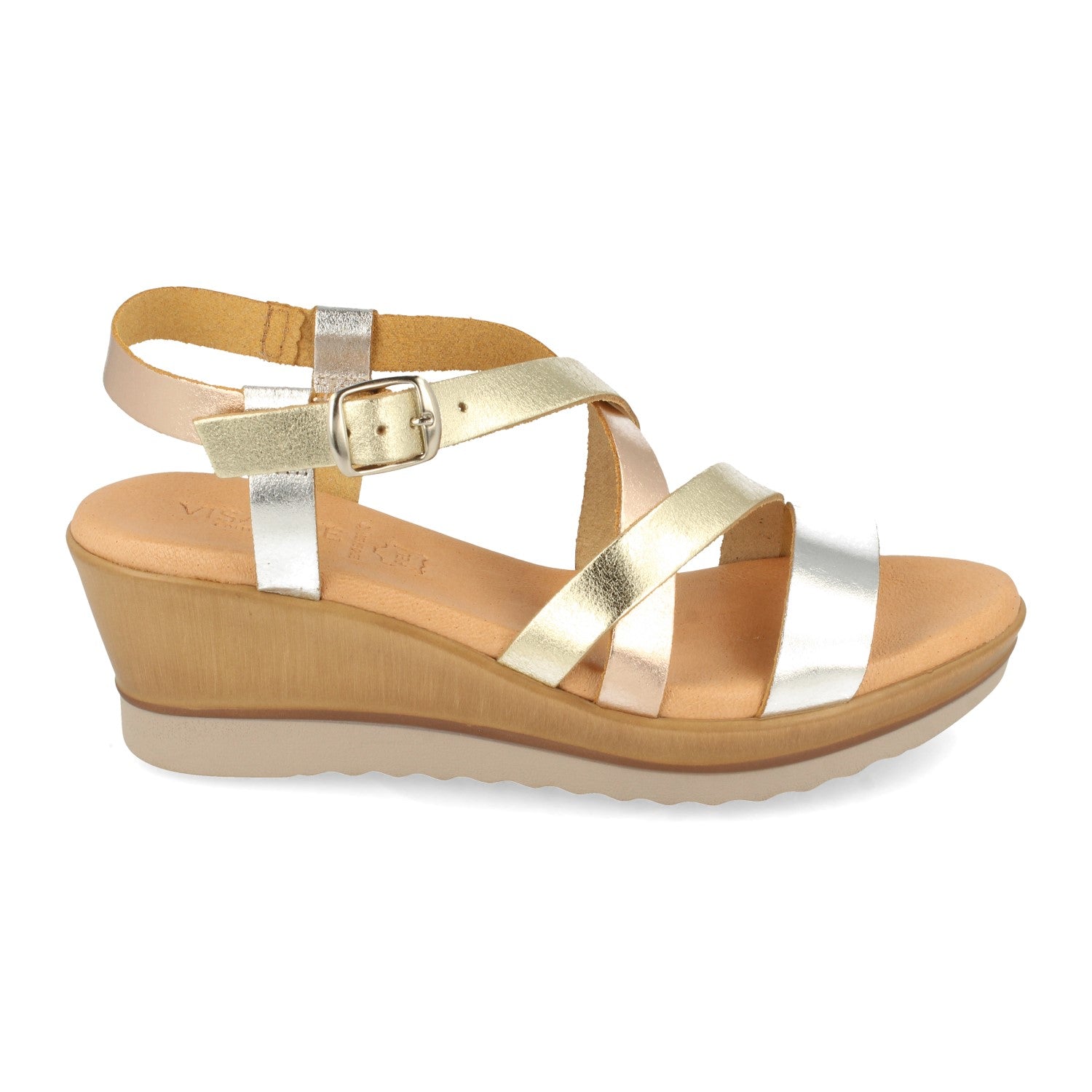 Sandalia de Cuña para Mujer Estilo Casual con Palas Cruzadas Multicolor y Cierre de Hebilla Fabricado con Piel Primavera Verano 2021