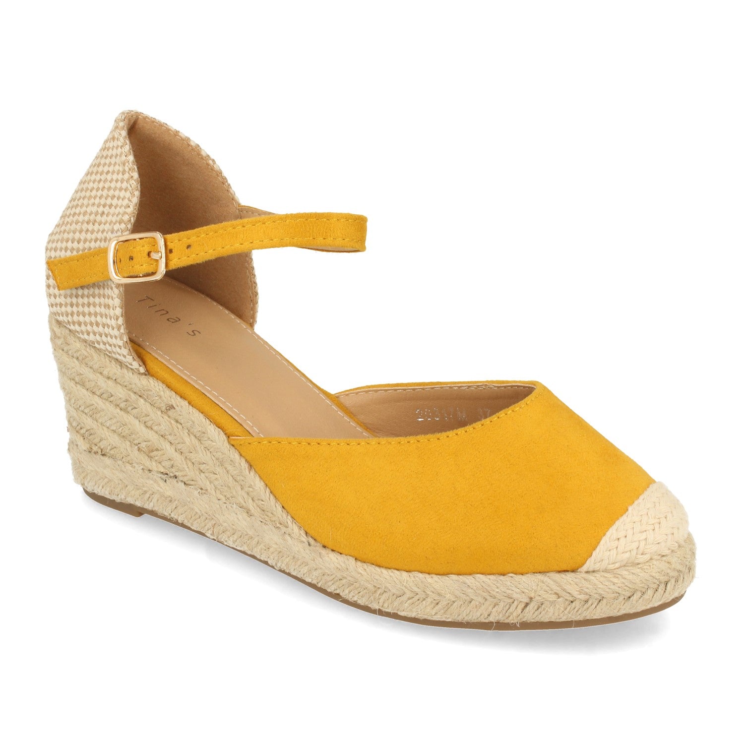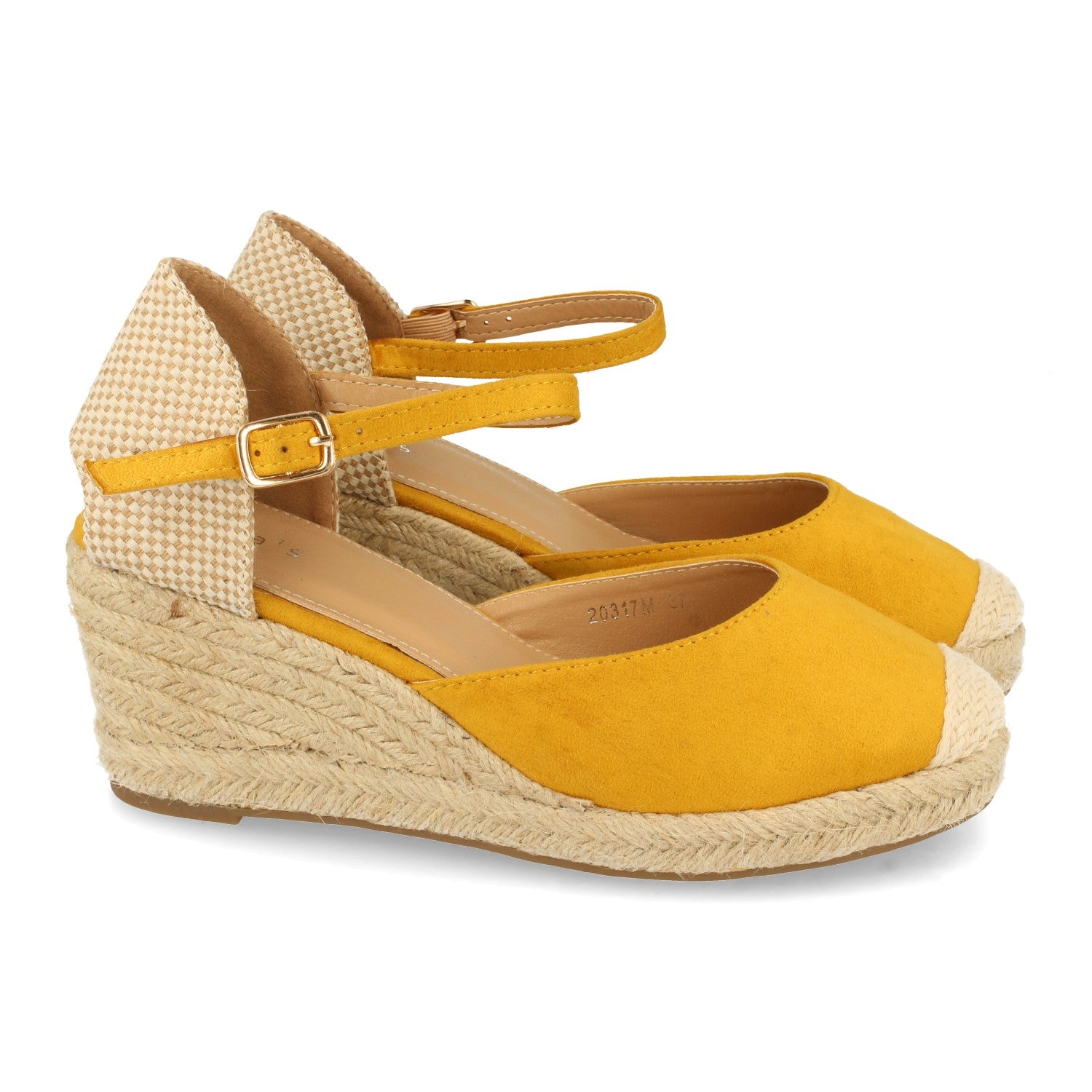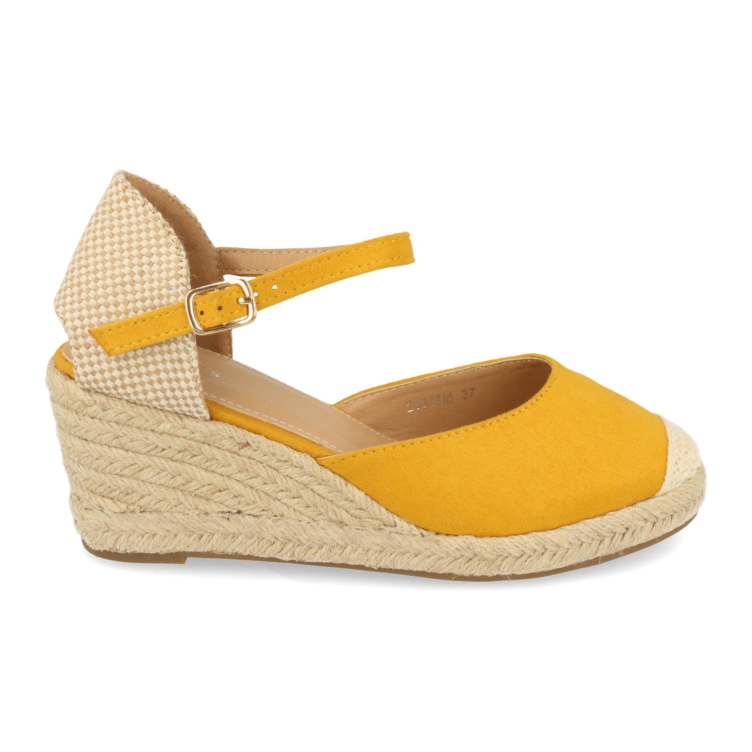 Sandalia de Cuña para Mujer Forrado de Yute Estilo Valenciana con Pala Cerrada y Cierre de Hebilla Primavera Verano 2021