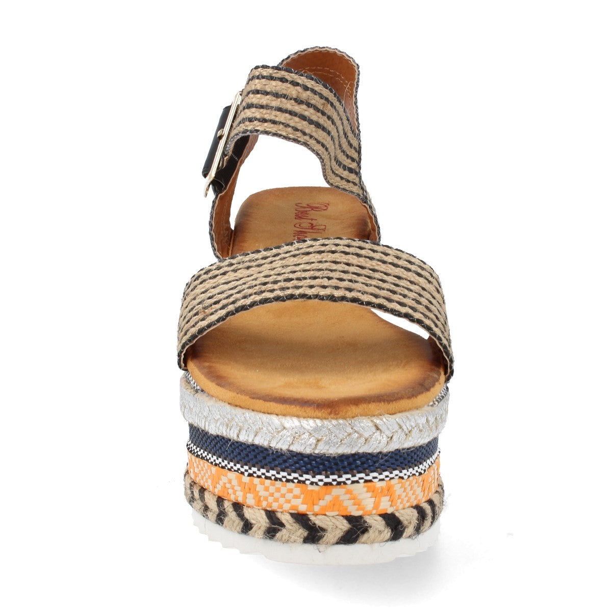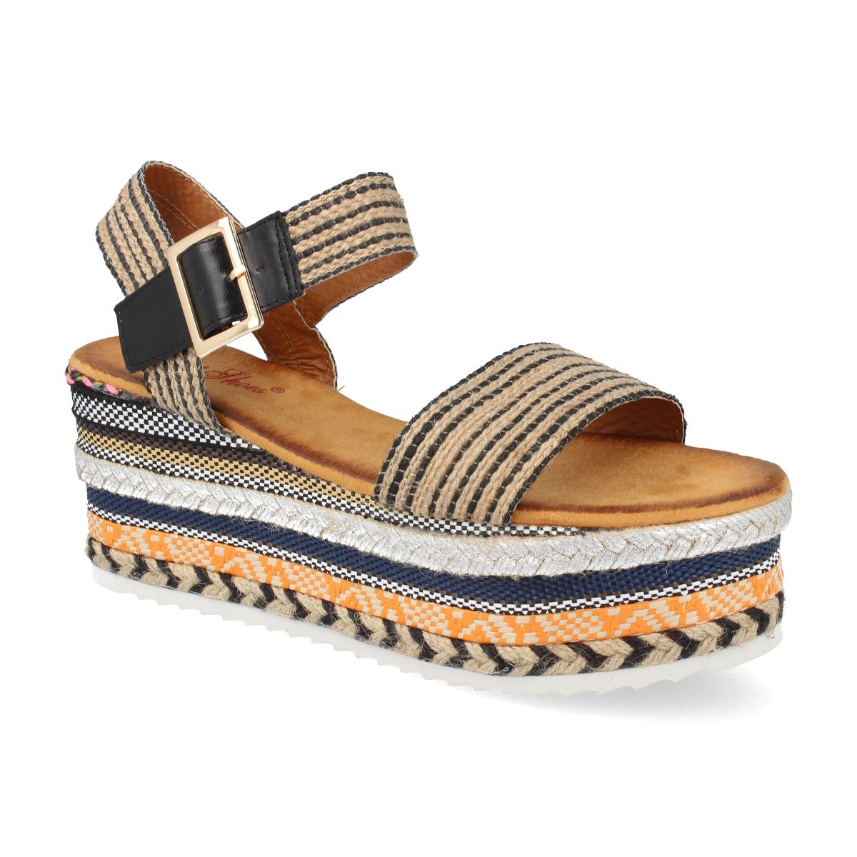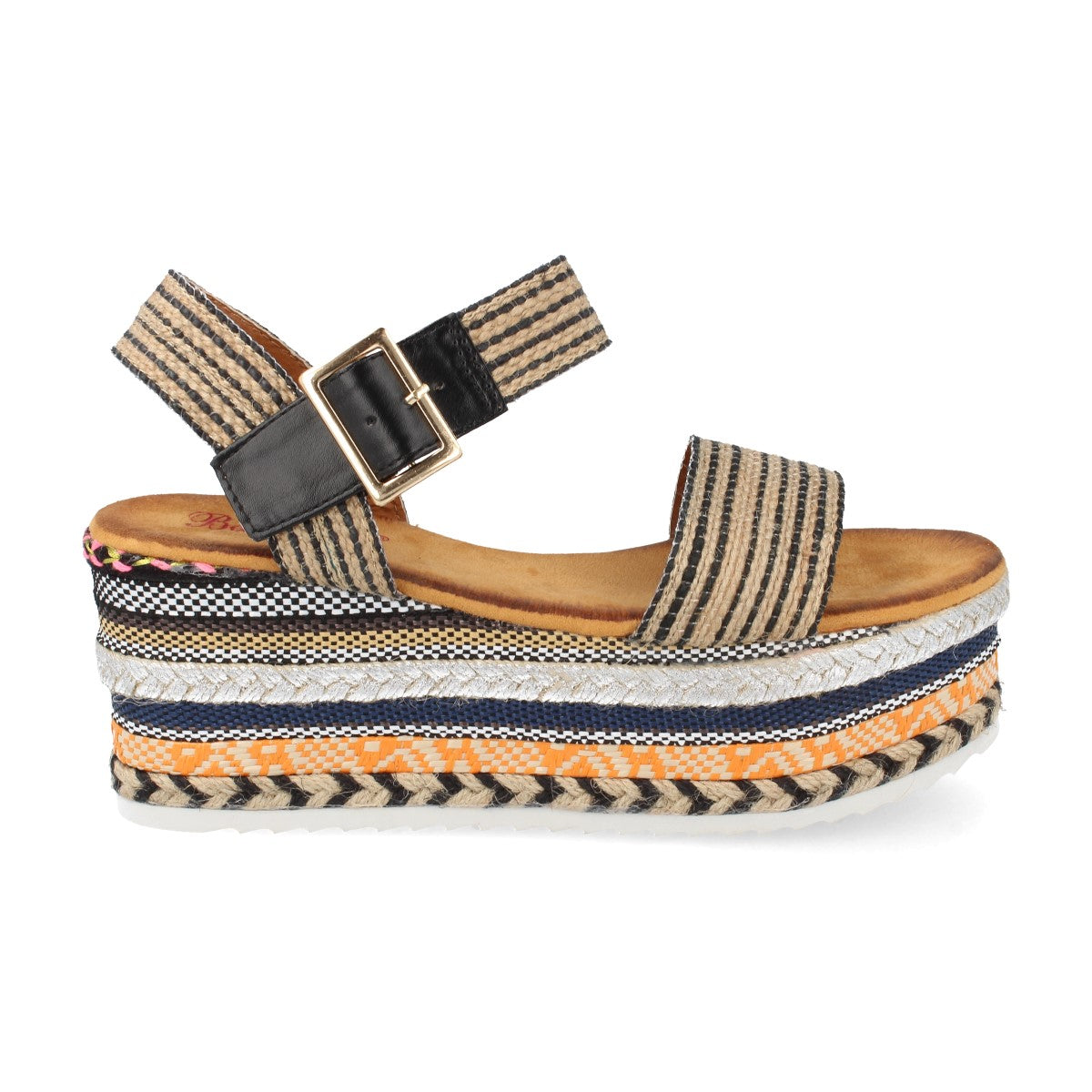 Sandalia con plataforma de yute con trenzados geométricos multicolor pala simple y cierre de hebilla en el tobillo.