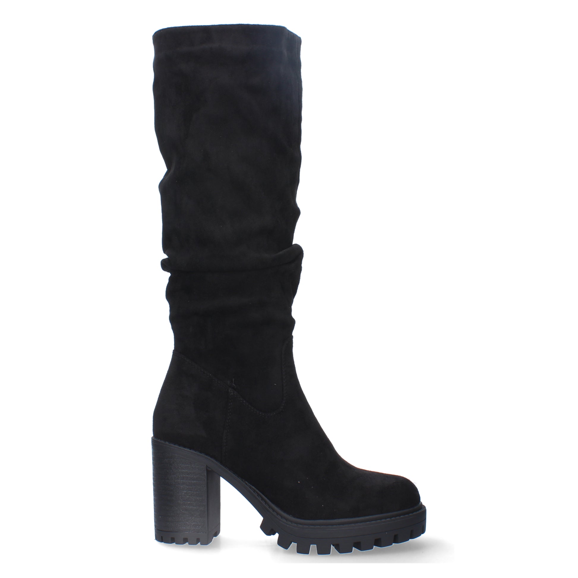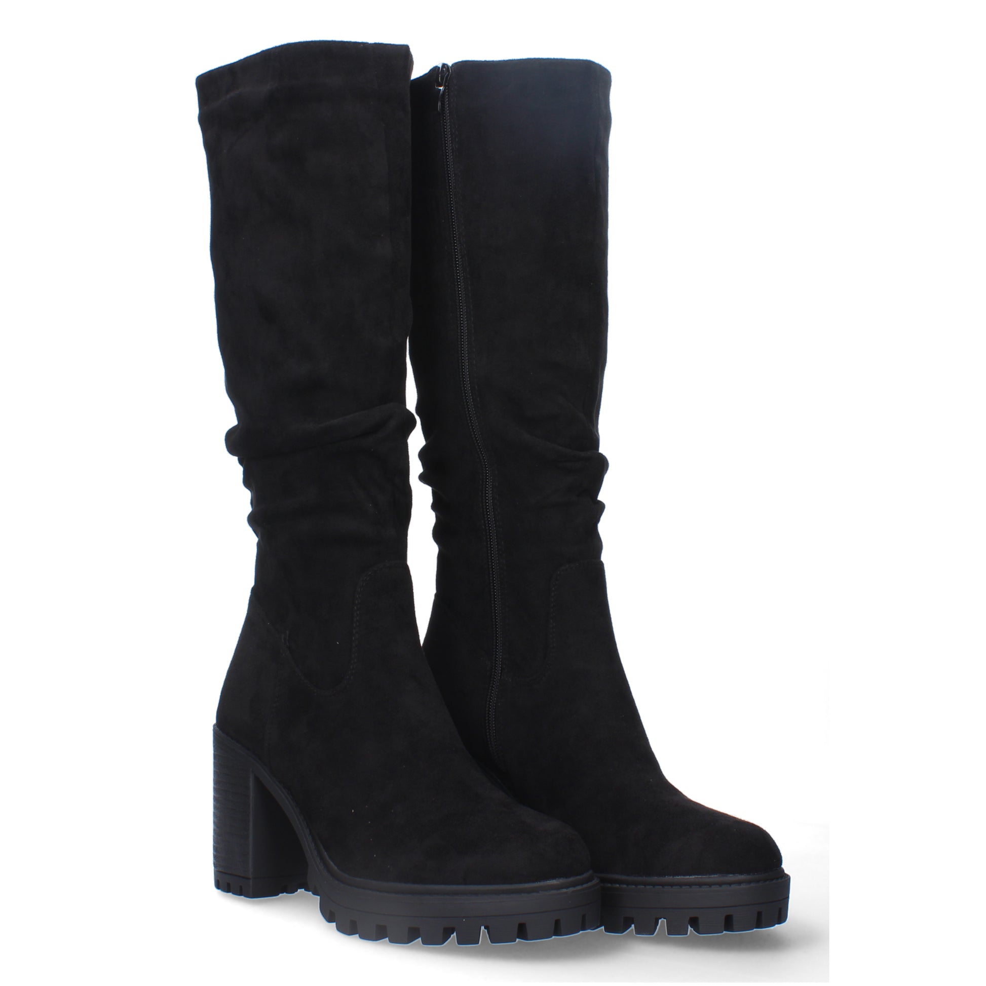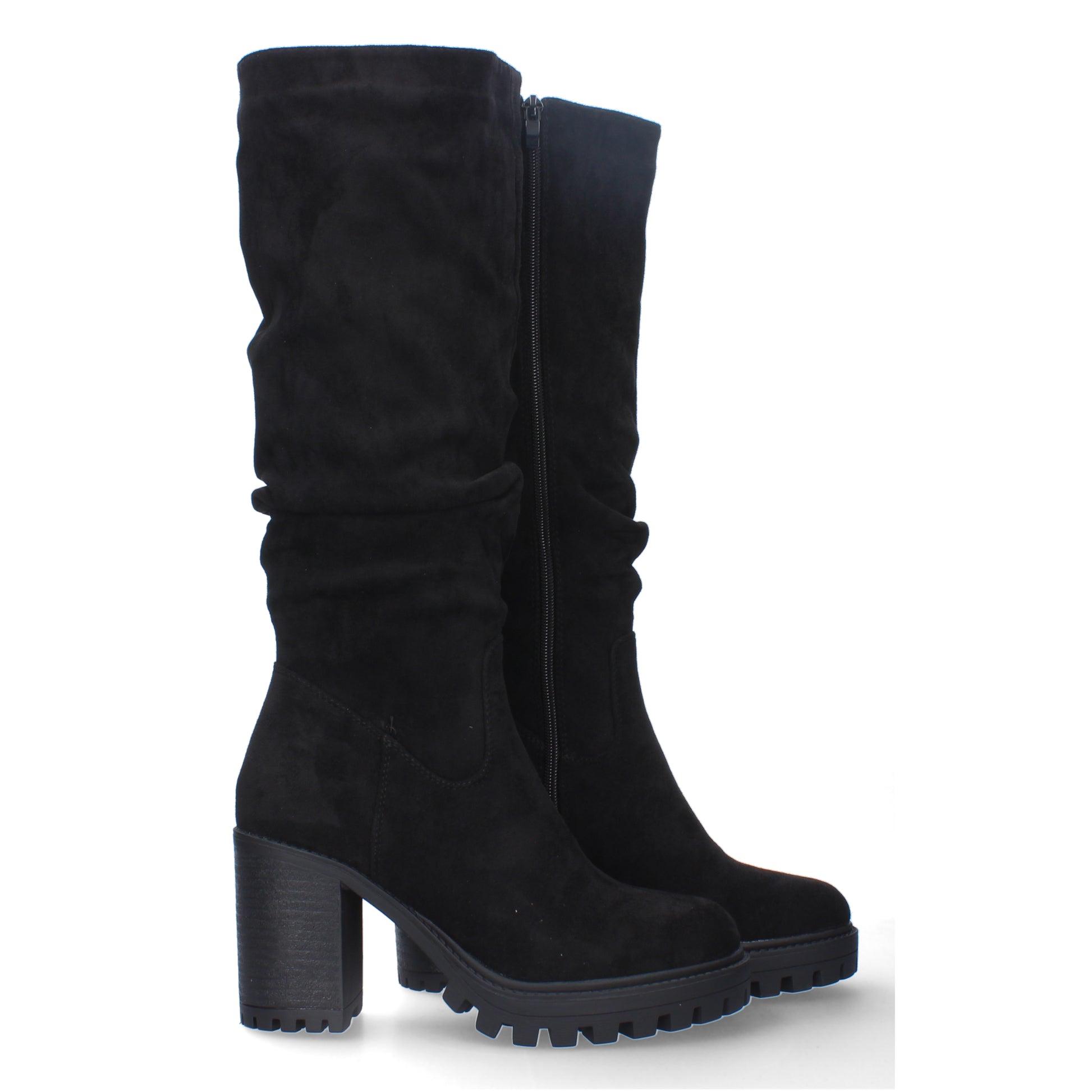 Bota de tacón comoda para mujer estampado liso con caña arrugada cierre de cremallera.