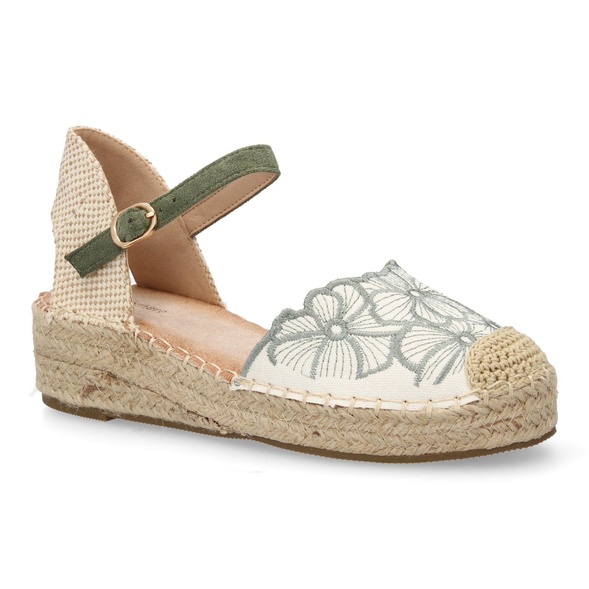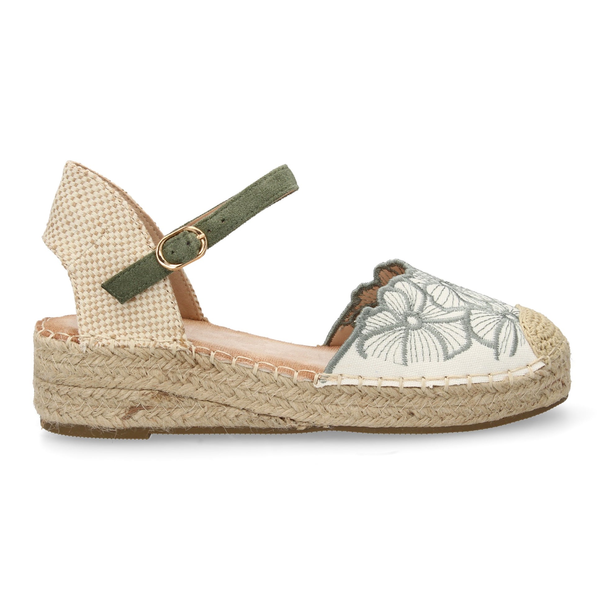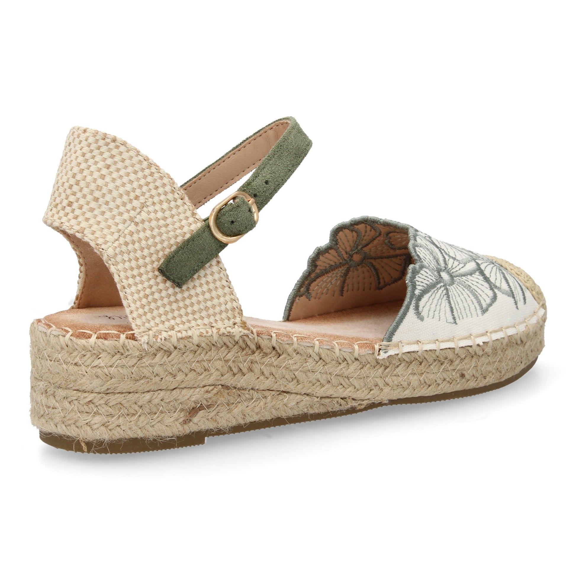 Sandalia de cuña de yute para mujer comodas y elegantes diseño de flores bordadas en la pala y cierre de hebilla ideales para primavera-verano.