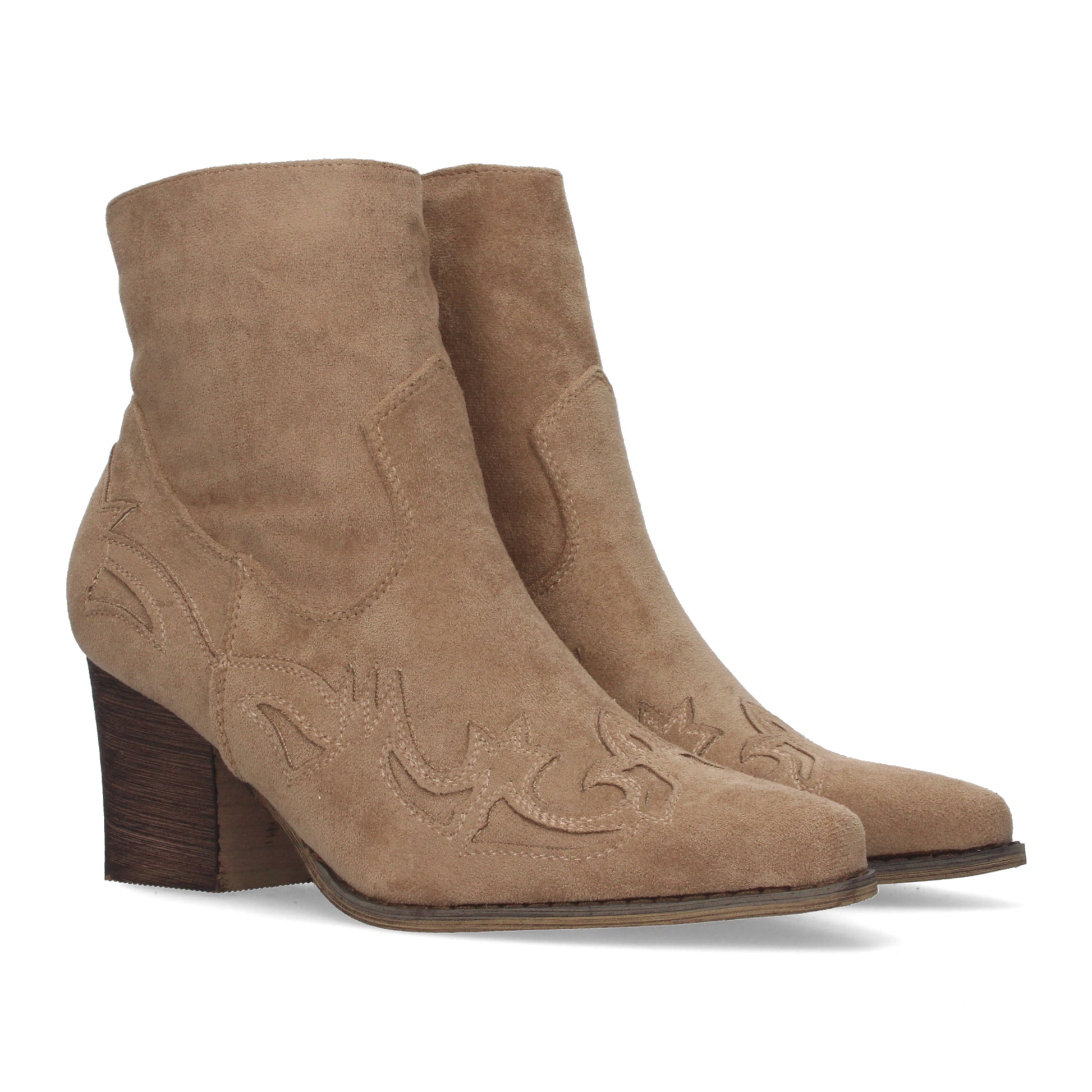 Botines camperos para mujer de tacon medio con adorno estilo cowboy en la puntera y en el talon y cierre de cremallera.