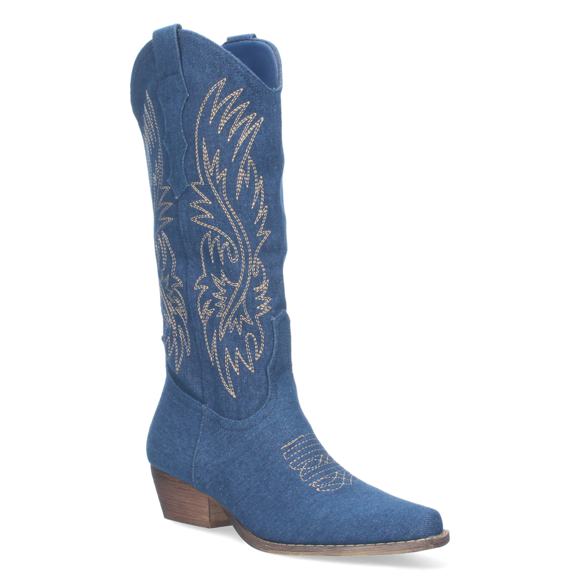 Bota campera con tacón y bordado dorado en la caña y en el empeine estético y tradicional estilo vaquero. La caña mide 34cm