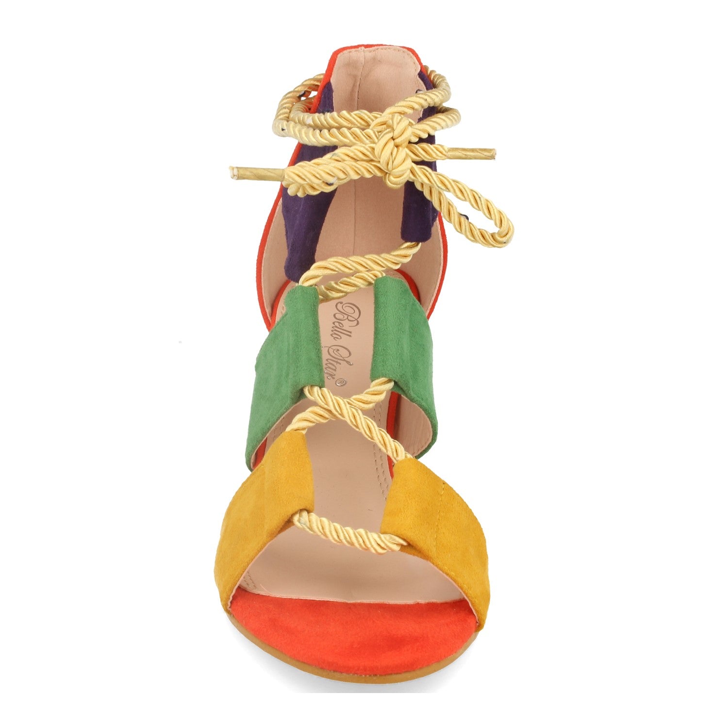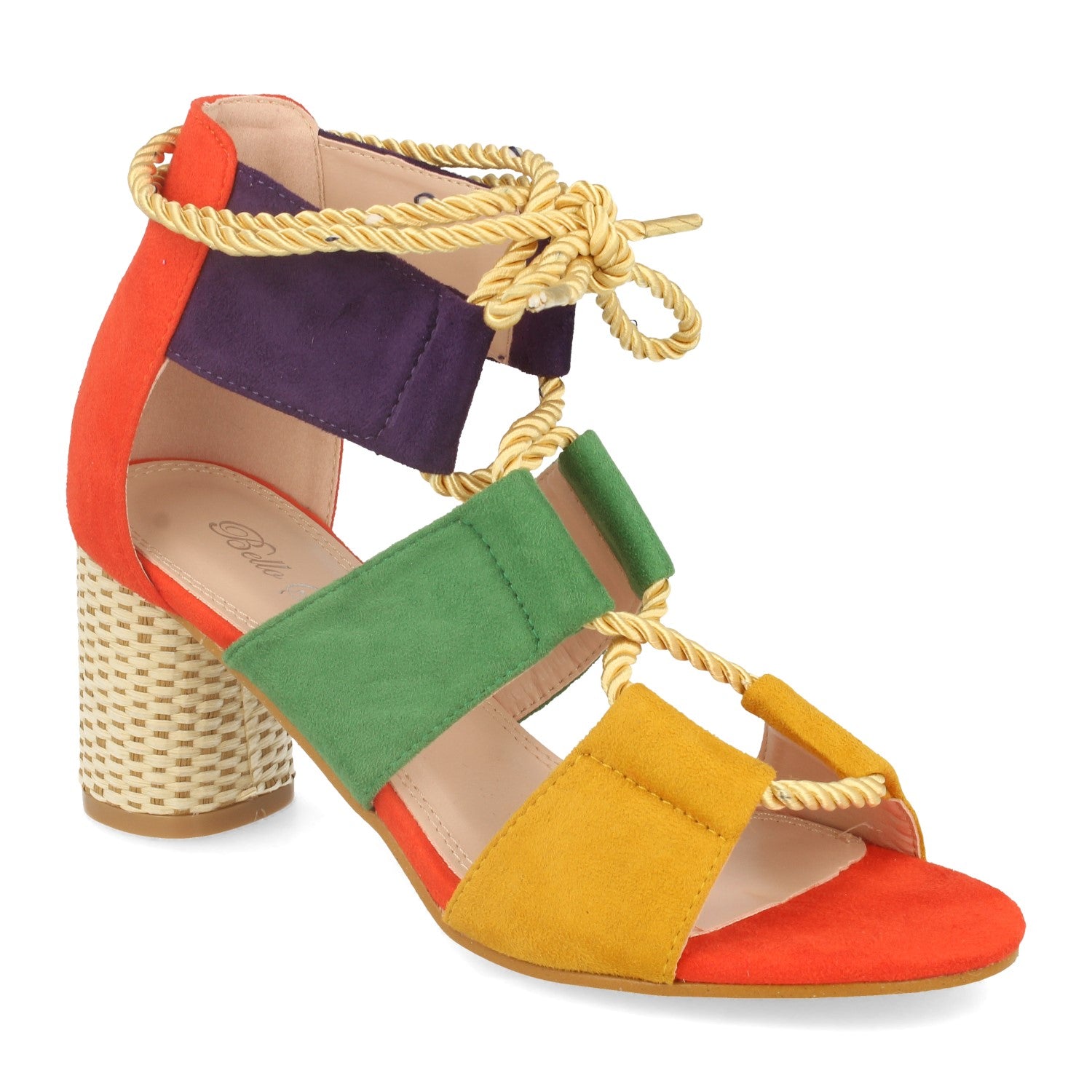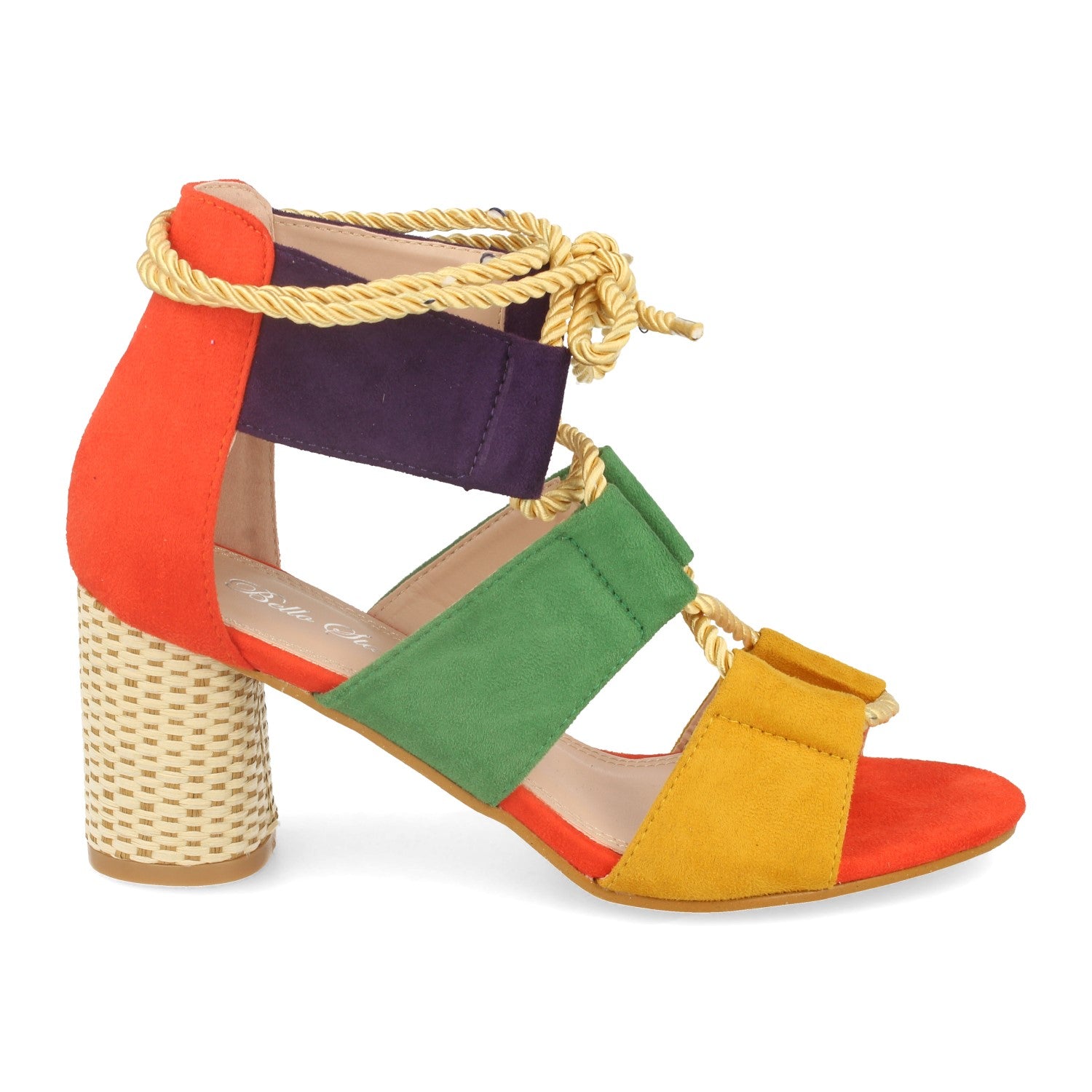 Sandalia Multicolor con Tacón en Forma Ovalada de Rafia con Cordones Cruzados en Pala Cierre en Tobillo. Primavera Verano 2020