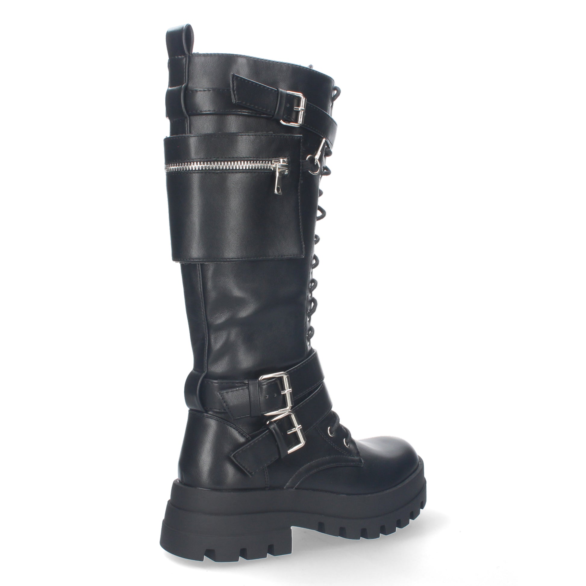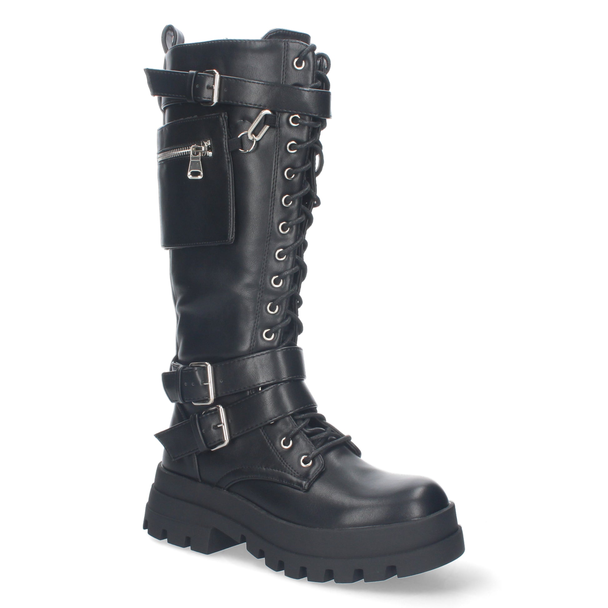 Botas comodas para mujer con suelda dentada y punta redonda adorno monedero en la caña cierre de cordones y cierre de hebilla.
