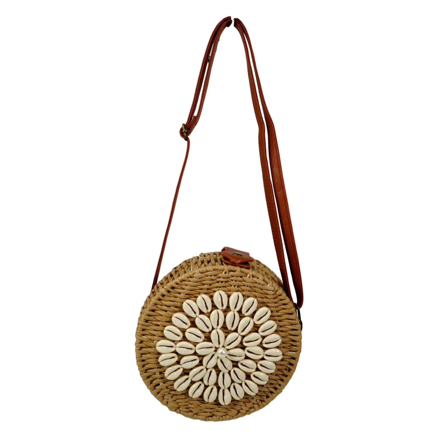 Bandolera Redondo de Rafia con Conchas Marineras Asa Ajustable Cierre de Boton Primavera Verano 2020