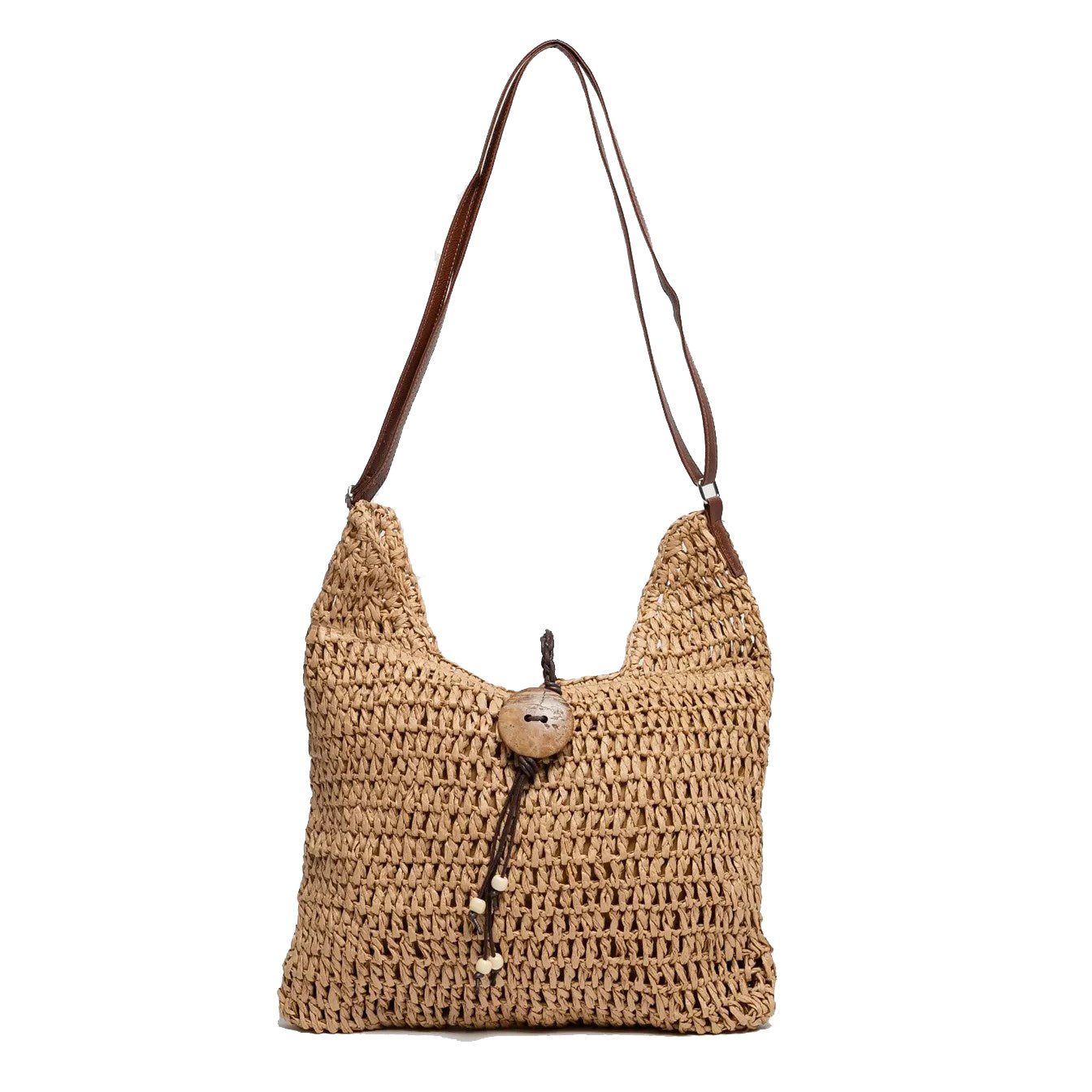 Bolso de Hombro para Mujer con Material de Rafia Correa Ajustable Cierre de Boton con Flecos y Bolsillo Interior