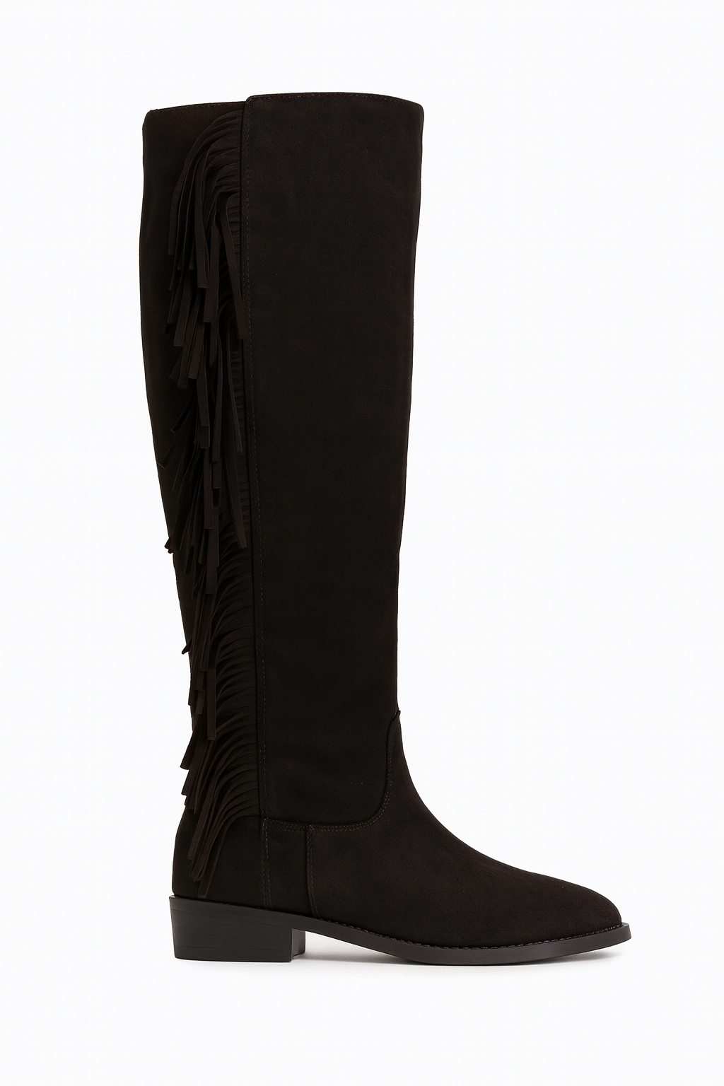 Bota alta en color negro, confeccionada en material efecto ante suave, diseñada para aportar estilo y personalidad a cualquier look. Su detalle de flecos laterales añade movimiento y un toque boho elegante que realza la silueta y marca tendencia.