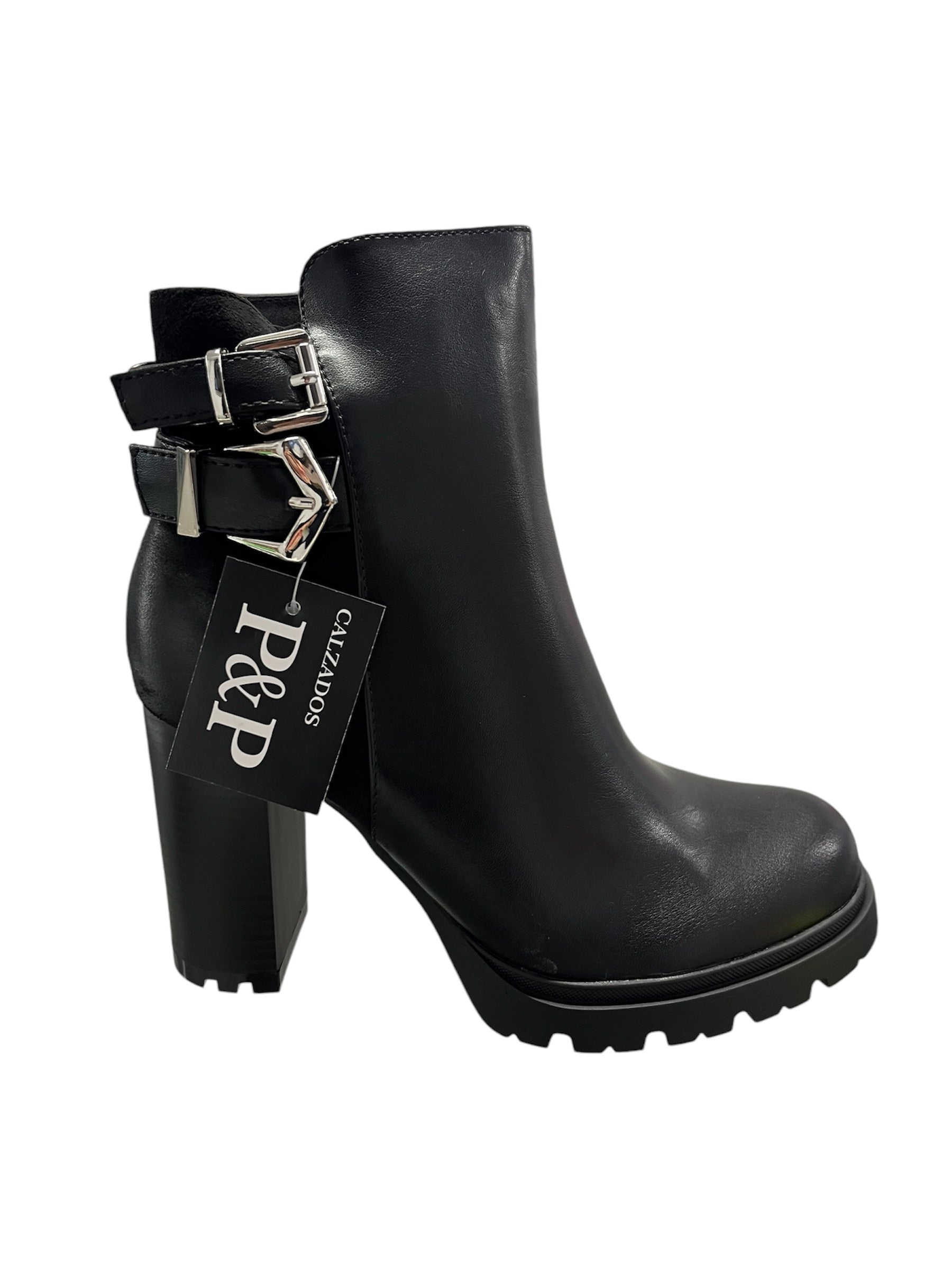 BOTIN DE MUJER CON TACON ALTO PERO COMODO, DE POLIPIEL, CON ALGO DE PLATAFORMA ALANTE PARA MAS COMODIDAD, DISPONIBLE SOLO EN COLOR NEGRO DE LA TALLA 36 A LA 41