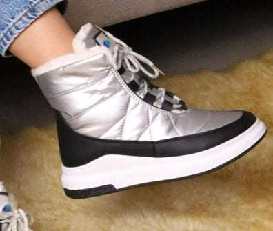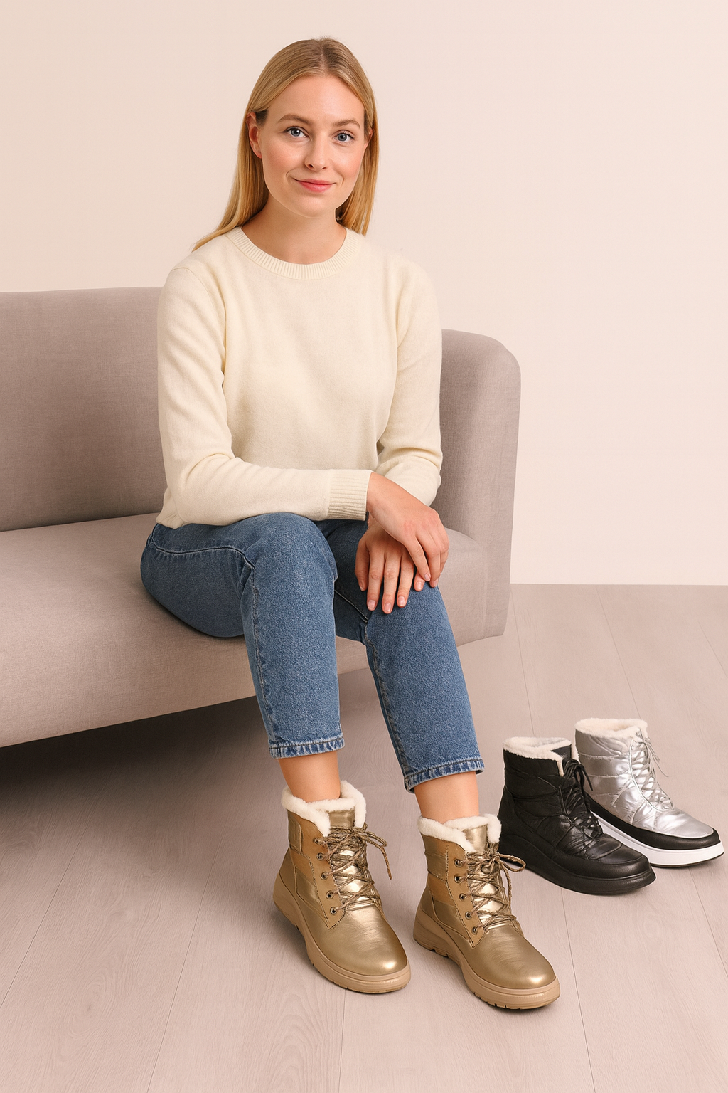 Este botín estilo snow es el must-have de la temporada para quienes buscan comodidad, calor y estilo incluso en los días más fríos. Su diseño acolchado impermeable mantiene tus pies secos, mientras que su interior con borreguito suave abriga de forma espectacular.
