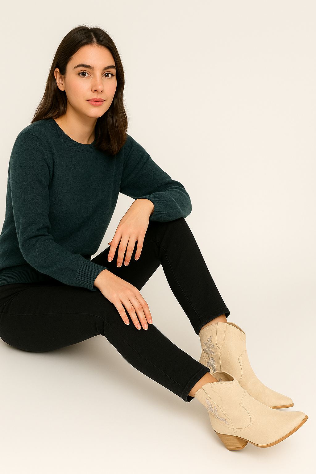 Apuesta por el estilo western con estos botines beige de mujer, perfectos para combinar con cualquier look de temporada. Su diseño tipo cowboy con bordado lateral añade un toque moderno y femenino, mientras que el tacón medio aporta comodidad durante todo el día. Ideales para llevar con vaqueros, vestidos o faldas, son el complemento perfecto para tu día a día o una salida casual.