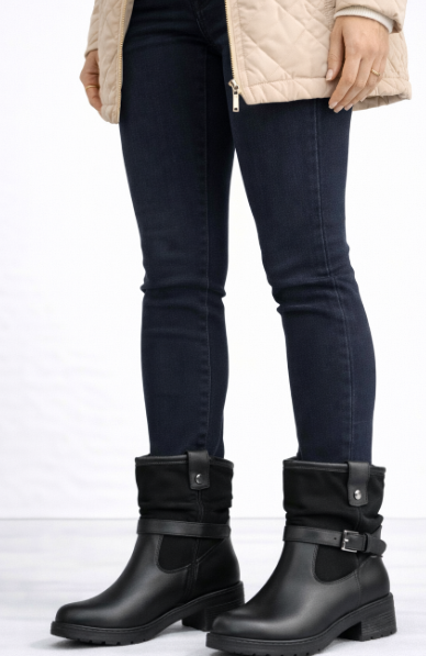 Botín de mujer en color negro, con un diseño moderno y funcional ideal para el uso diario. Fabricado en material suave tipo ante y piel, destaca por su hebilla lateral decorativa y su acabado elegante que aporta personalidad al look.