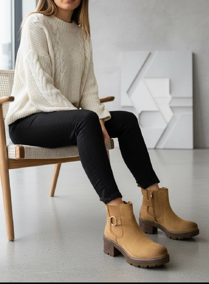 Dale un toque elegante y moderno a tus looks con nuestro botín verde oliva con hebilla dorada, un diseño exclusivo que combina estilo y comodidad en cada paso.