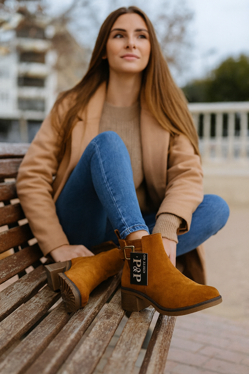 Dale un toque sofisticado a tu look con los botines camel de tacón medio Calzados P&P. Confeccionados en acabado tipo ante, incluyen detalle lateral de hebilla dorada que aporta elegancia y estilo. Su tacón ancho ofrece estabilidad y comodidad, perfectos para llevarlos durante todo el día. Un diseño versátil que combina con jeans, vestidos o faldas para cualquier ocasión.