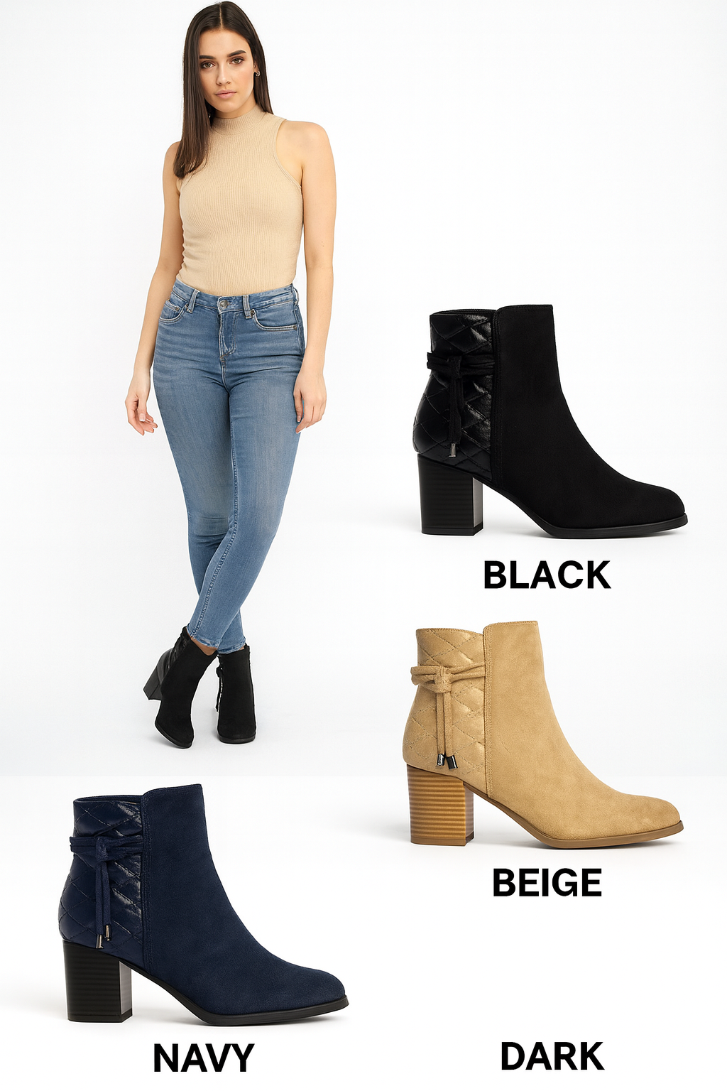 BOTINES ELEGANTES DE MUJER CON TACON MUY COMODO, CORDONES DE ADORNO, DE ANTELINA, EN TRES COLORES, BEIGE, AZUL Y NEGRO