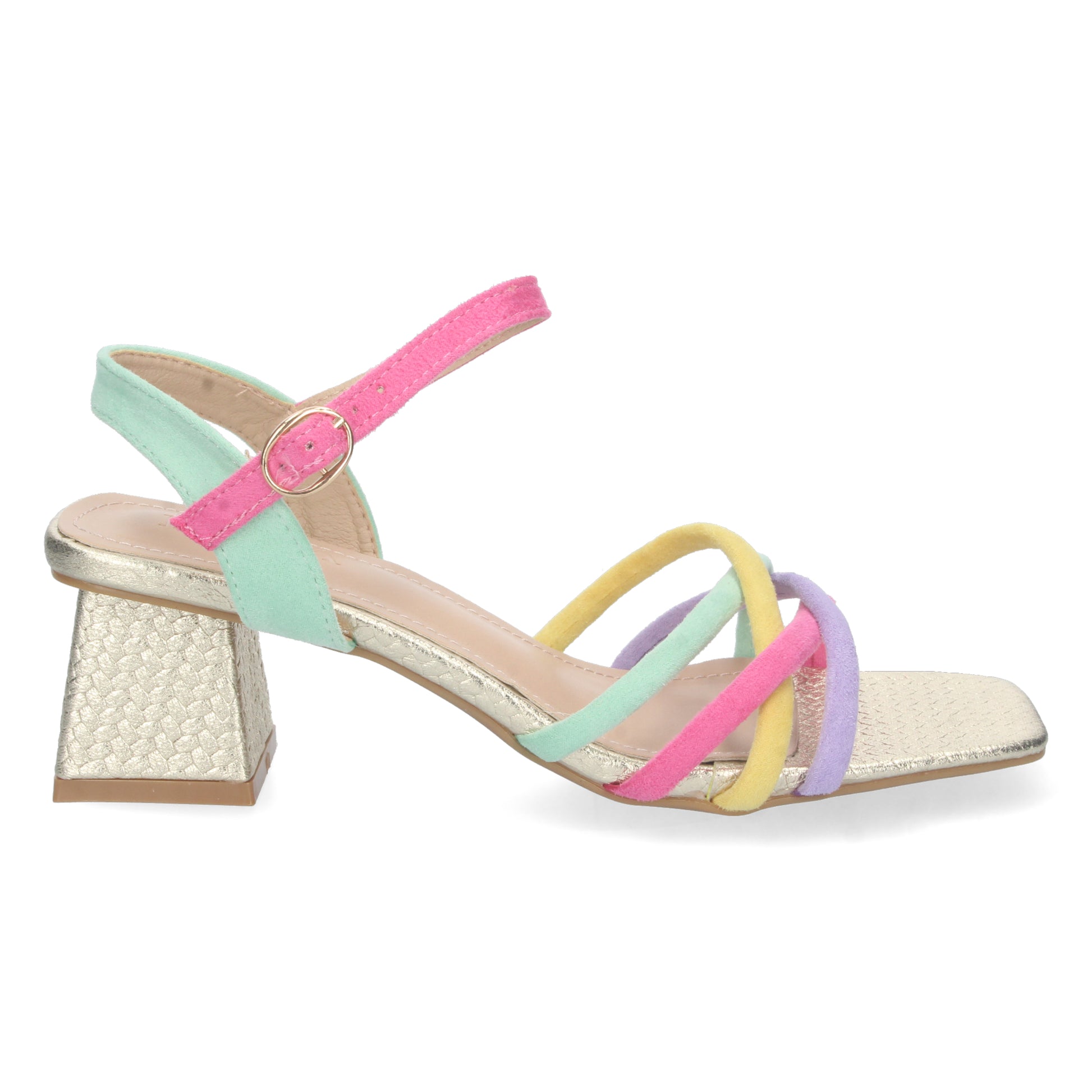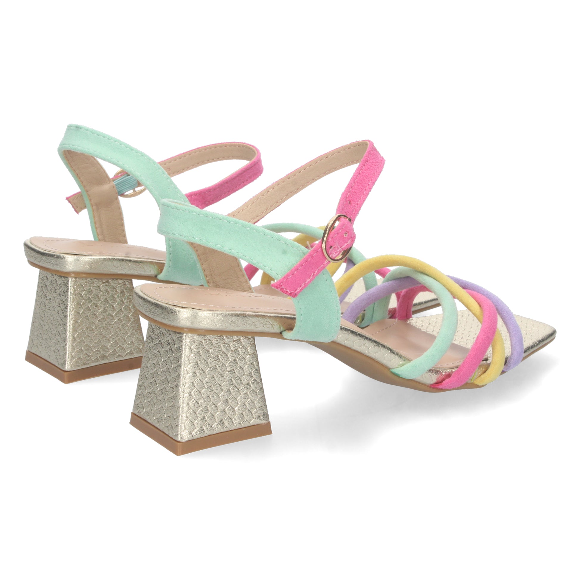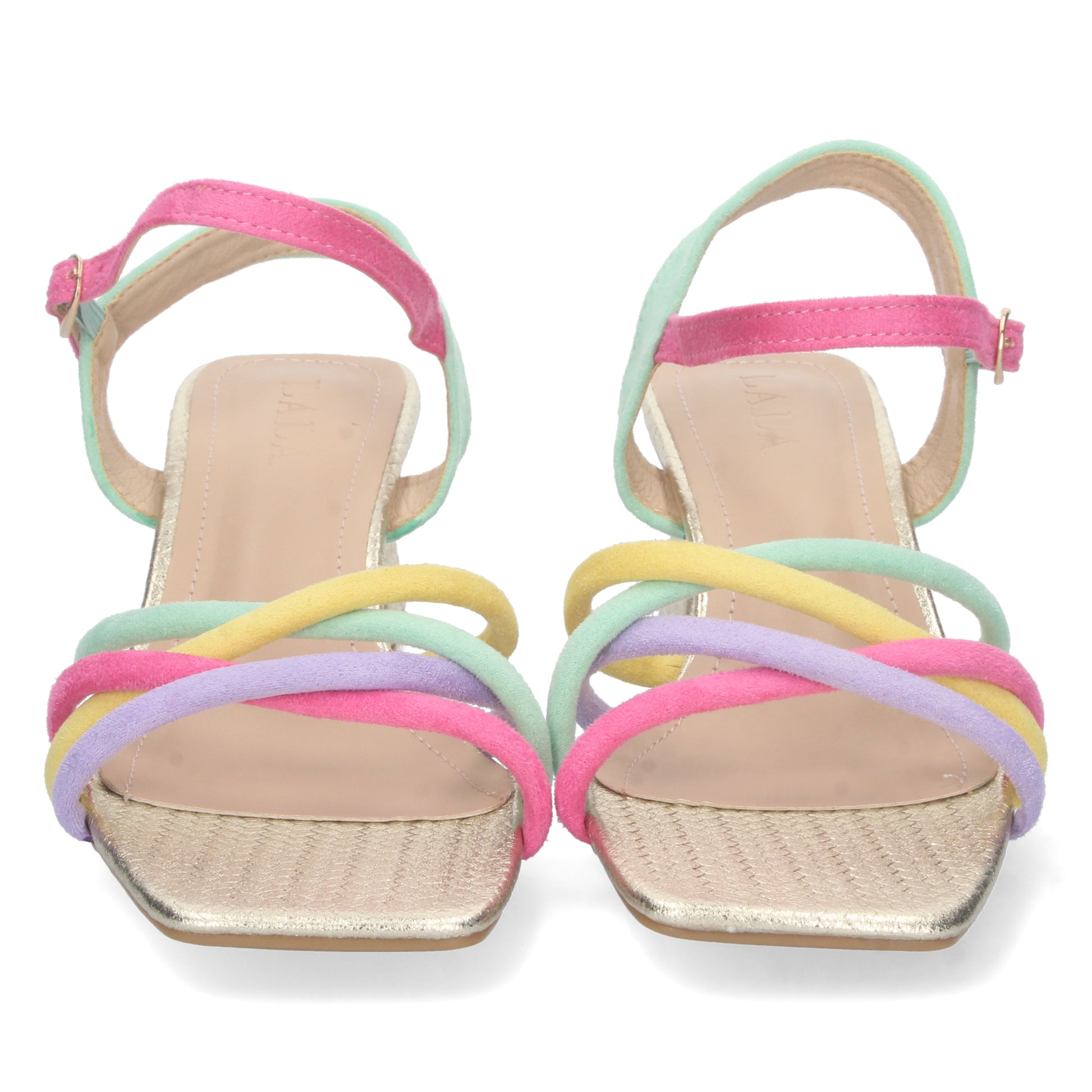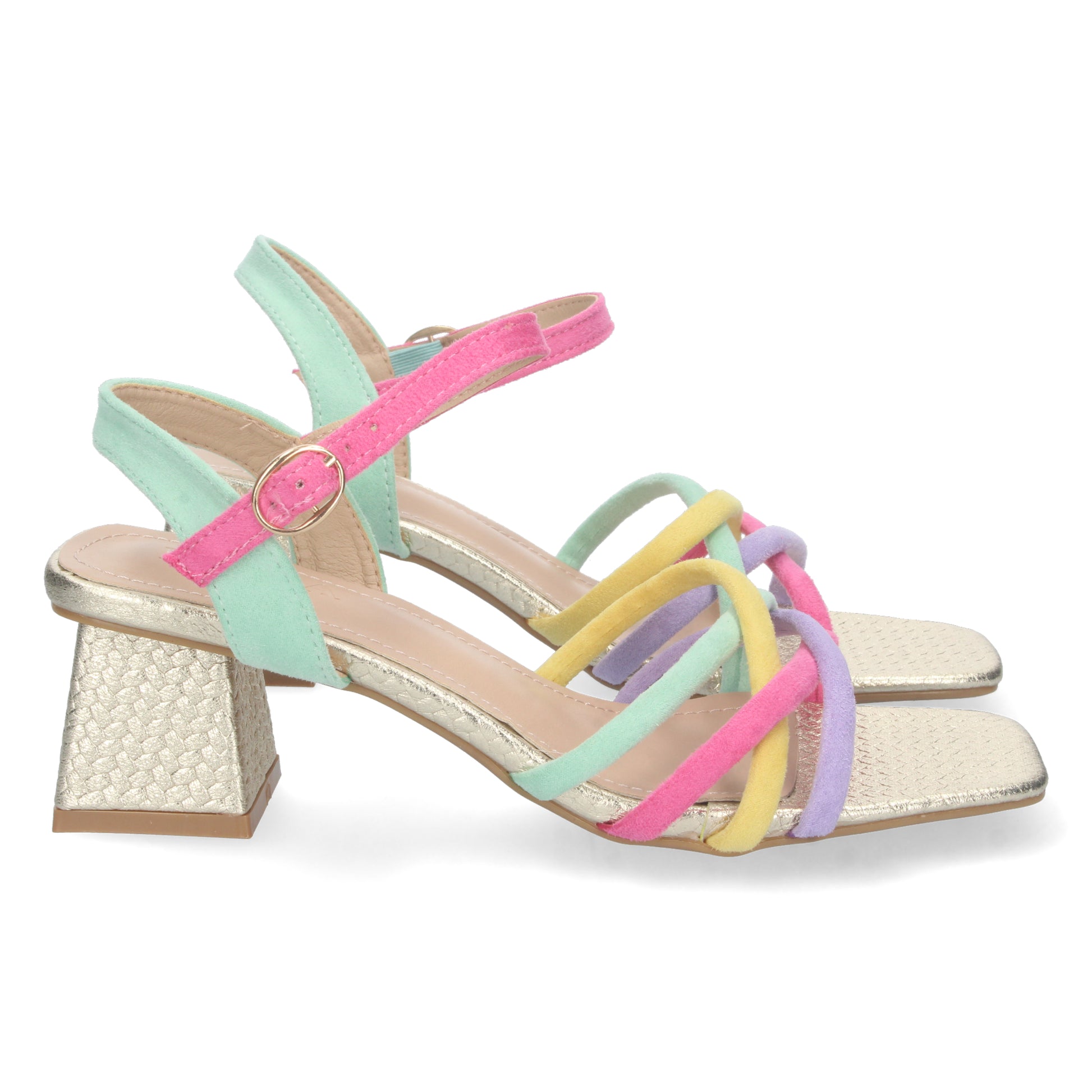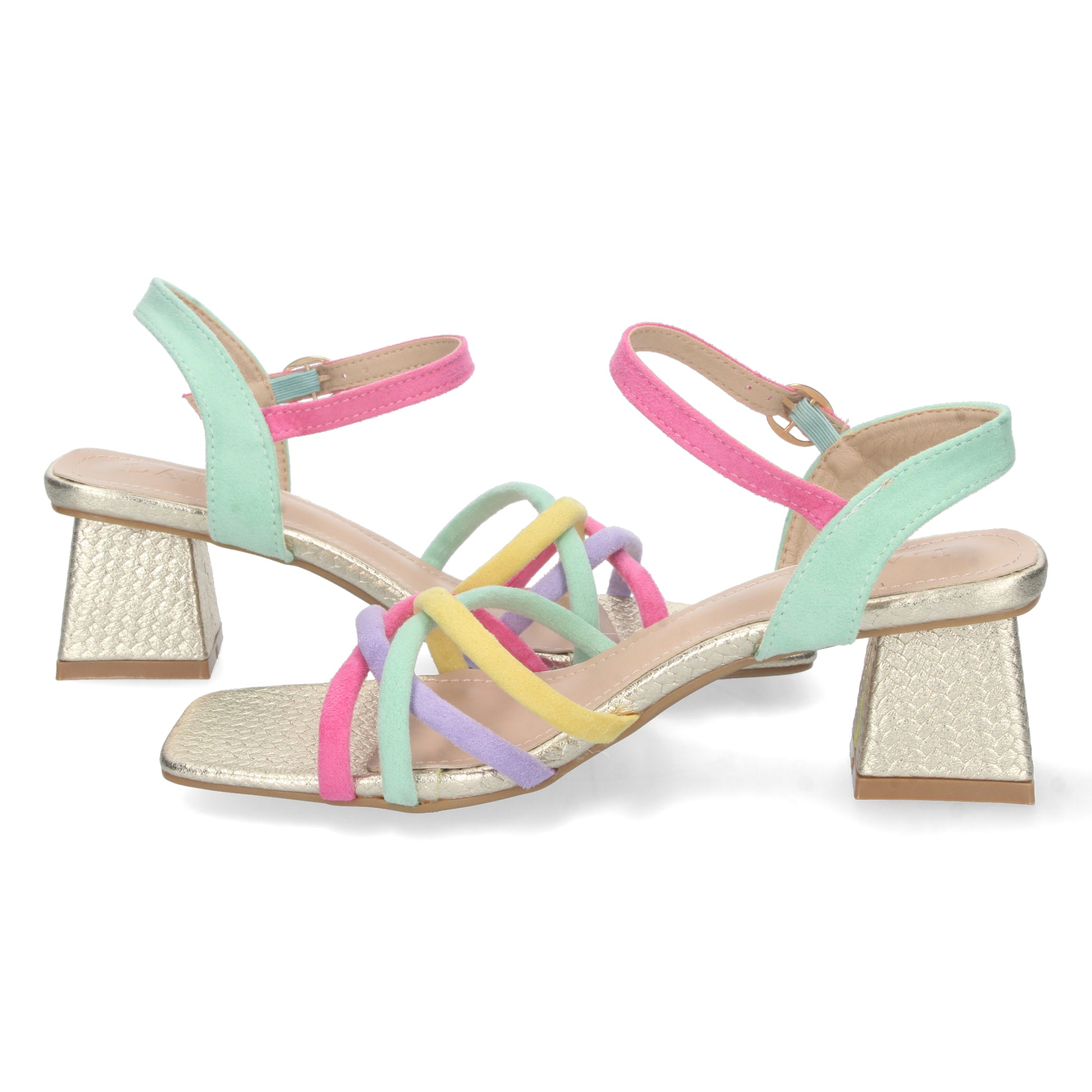 Sandalia de Tacon Bajo para Mujer Comodo con Estampado Tiras Multicolor y Cierre de Hebilla en el Tobillo