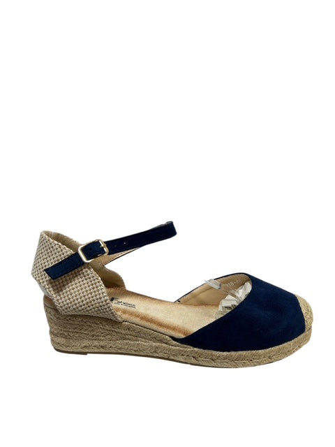 Estas sandalias tipo alpargata con cuña de yute combinan el estilo mediterráneo con la comodidad que necesitas para tu día a día. Su diseño con talón cerrado y pulsera ajustable al tobillo ofrece sujeción y elegancia, mientras que el color azul marino las convierte en una opción versátil para combinar con faldas, vestidos o jeans.