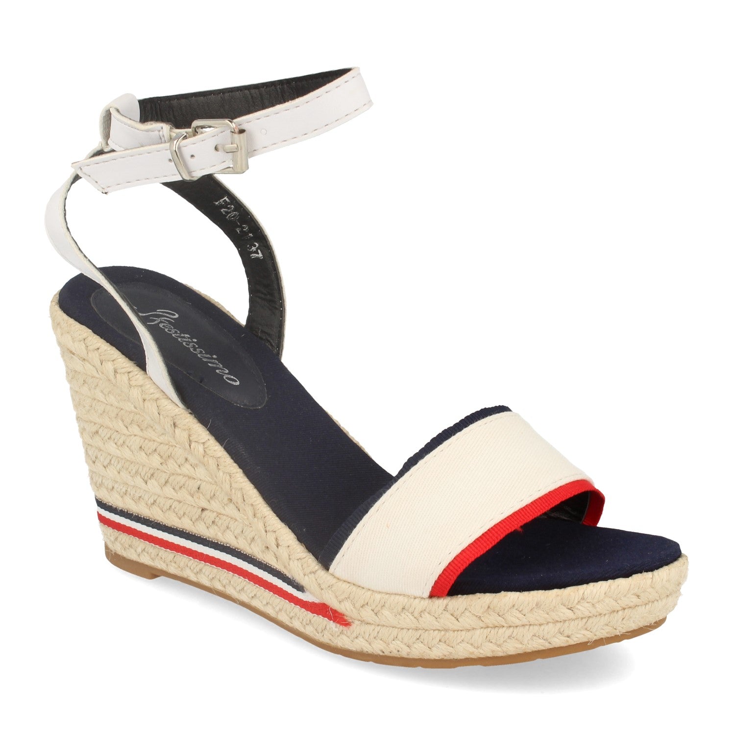 Sandalia de Cuña para Mujer con Pala Fina Talon Abierto Cierre de Hebilla Banda de Nylon en Colores y Piso de Yute Primavera Verano 2020