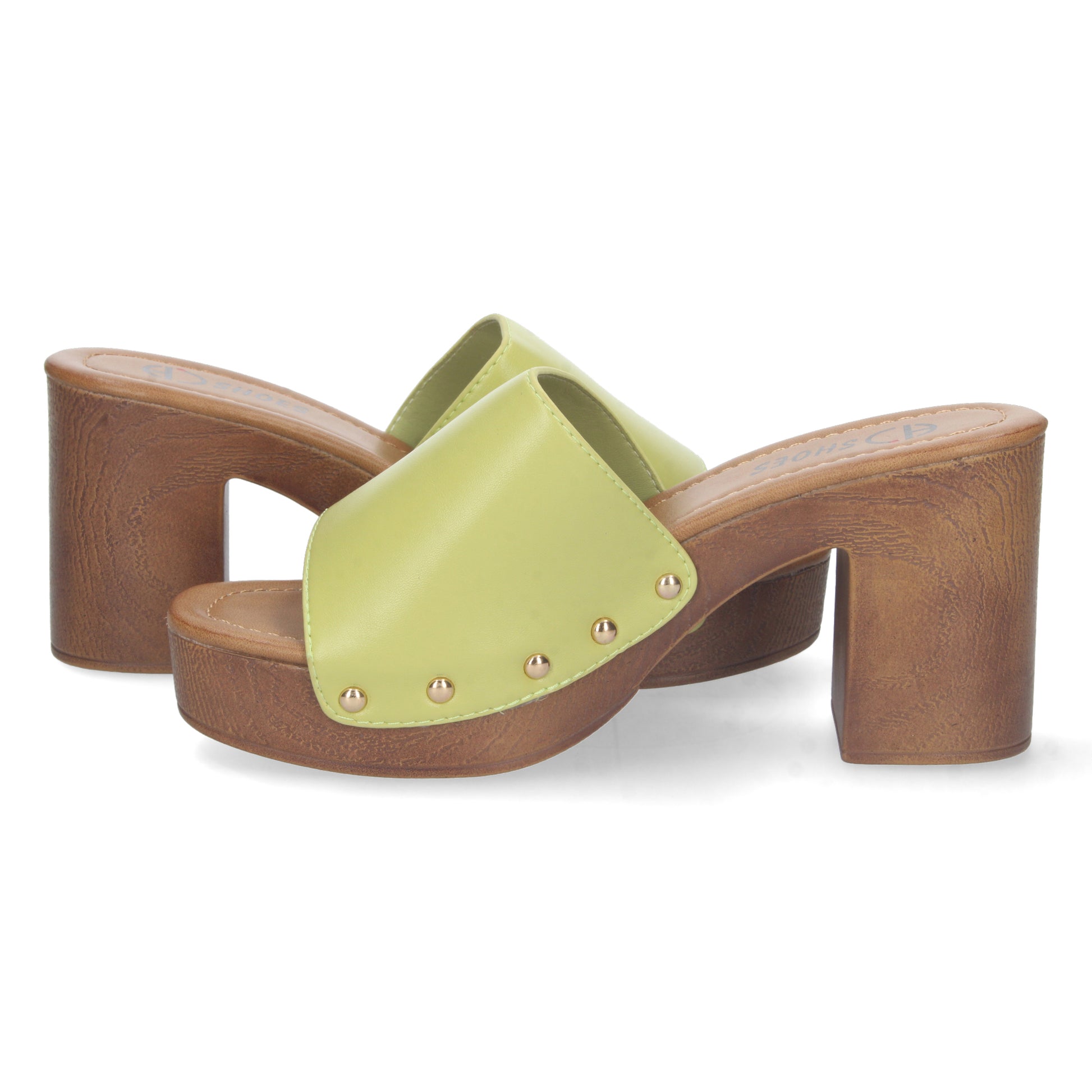 Zueco de Tacon Alto para Mujer Comodo Material de Imitacion a Madera Pala Lisa con Remaches y Talon Abierto