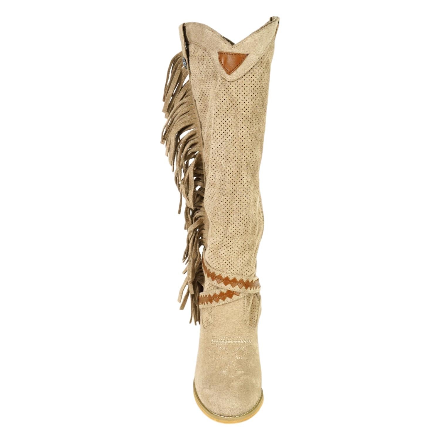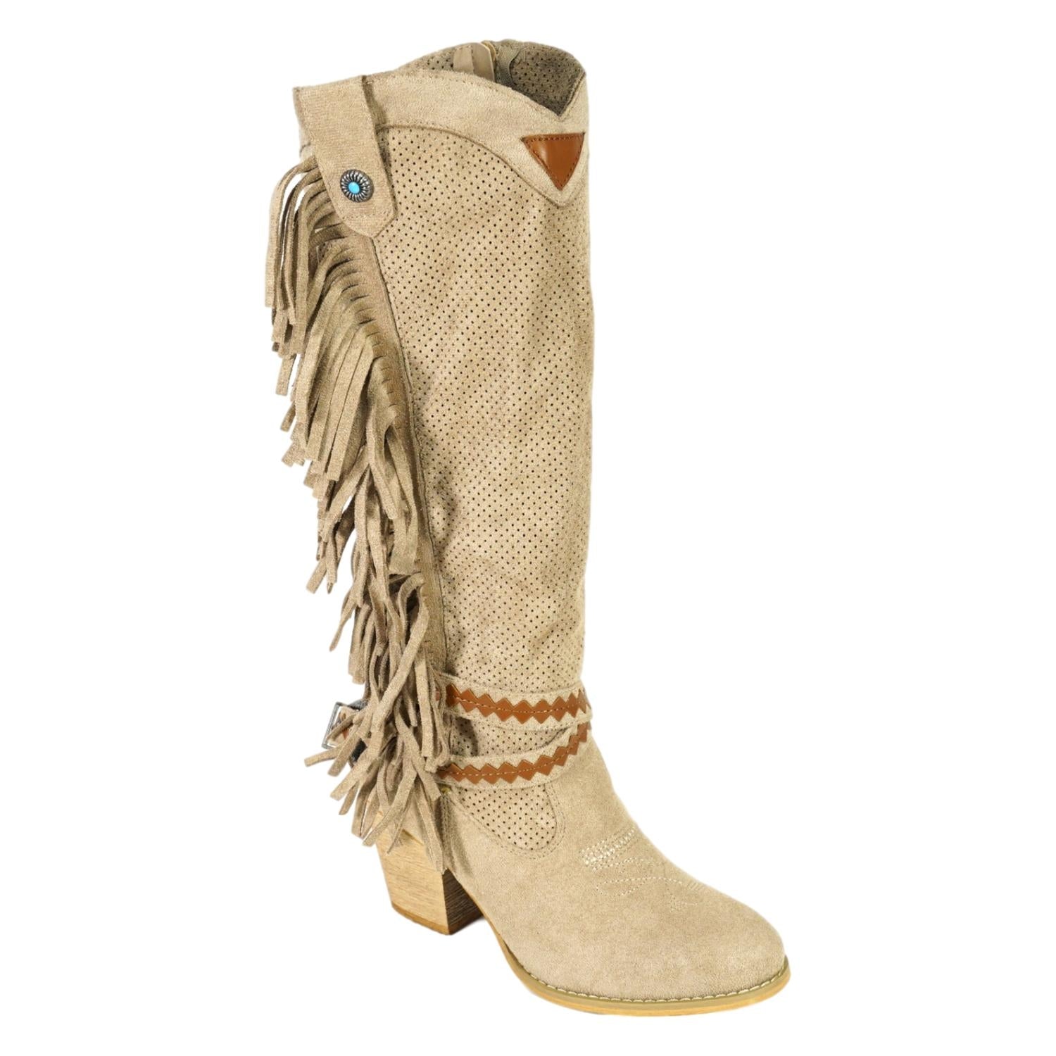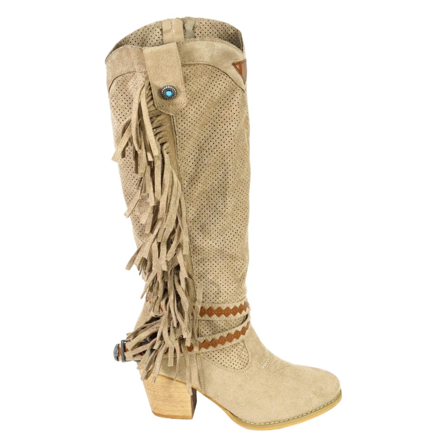 Bota Alta de Mujer Estilo Campero con Tacon Flecos Grabado en Empeine Adornado con Tiras Cierre de Cremallera y Hebilla. Primavera Verano 2020