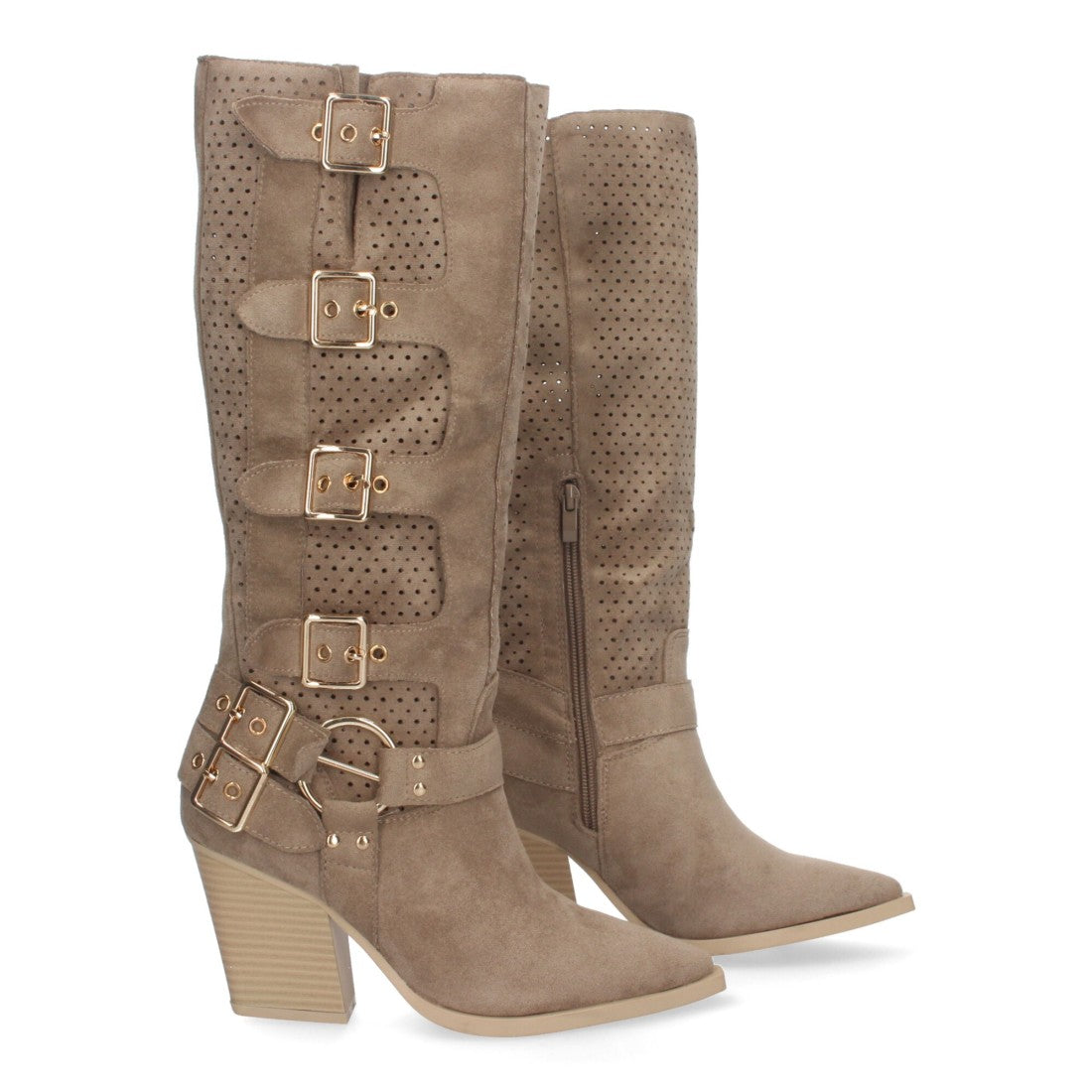 Botas Elegantes de Mujer con Tacón Cómodas Adornos de Hebillas Caña Calada Cremallera Lateral Perfectos para Toda Ocasión.