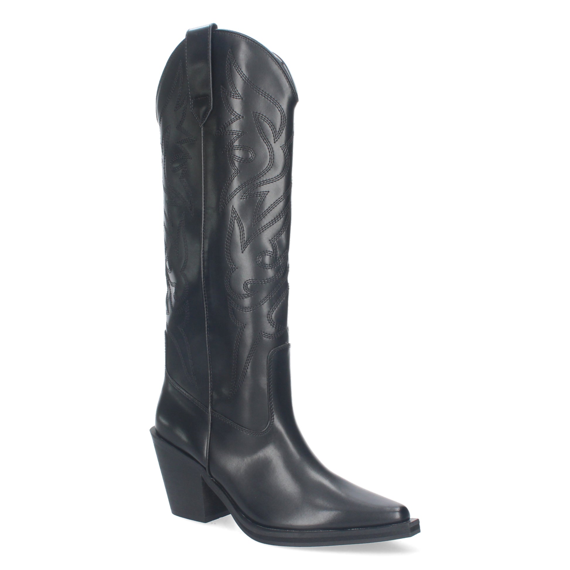 Bota de tacon cubano para mujer estilo cowboy bordado en caña y cierre de cremallera.