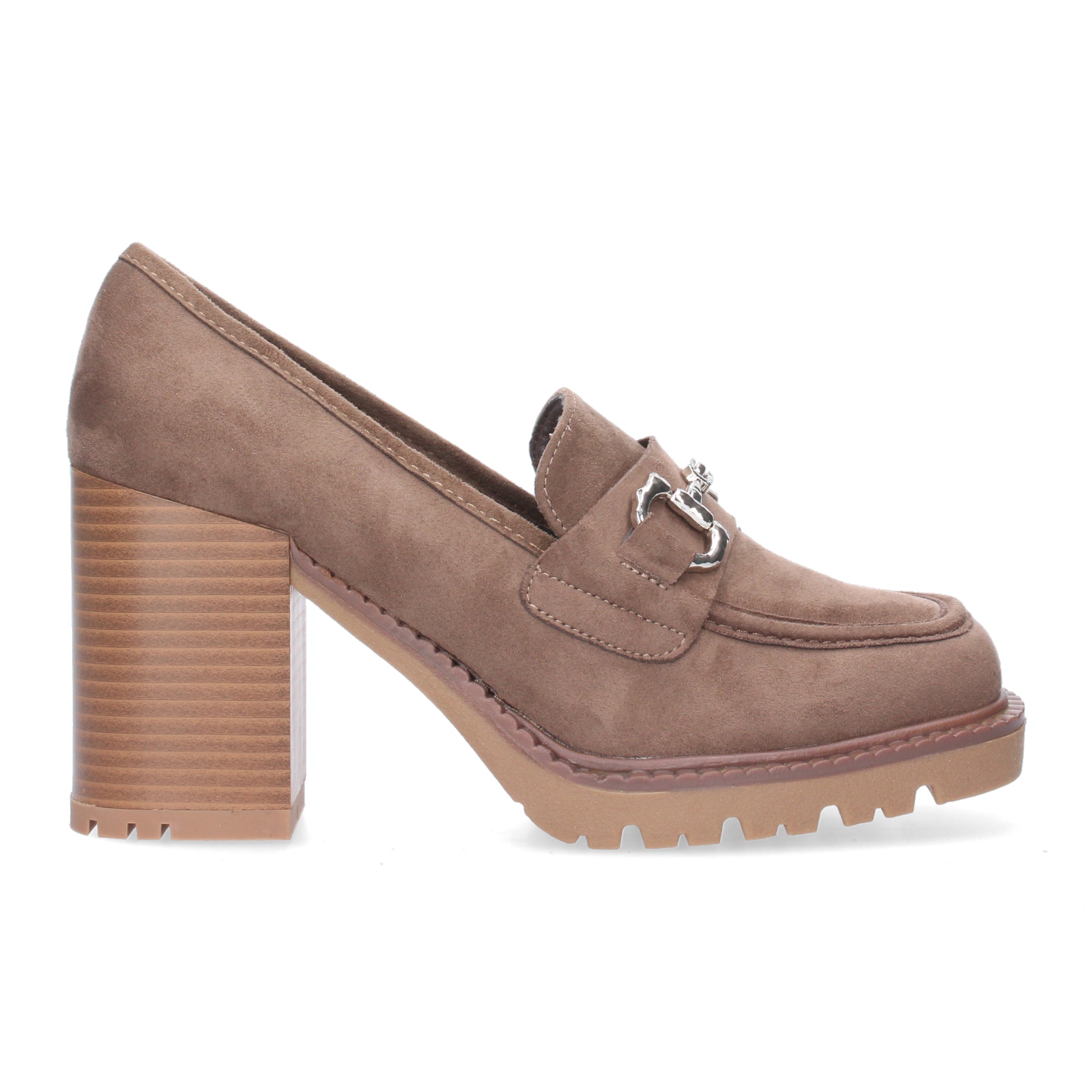 Mocasin de tacon para mujer con adorno metalico en la pala y material aterciopelado.