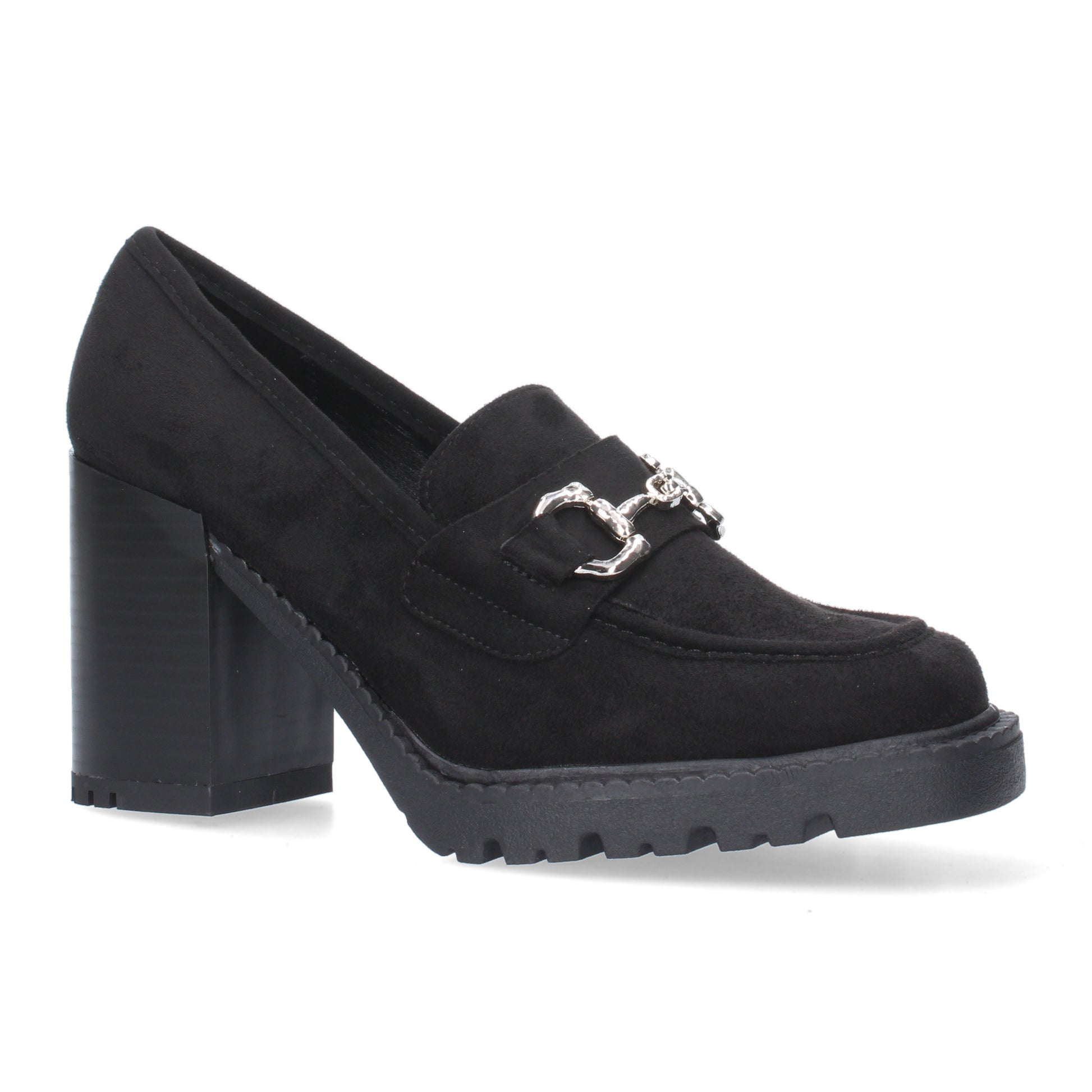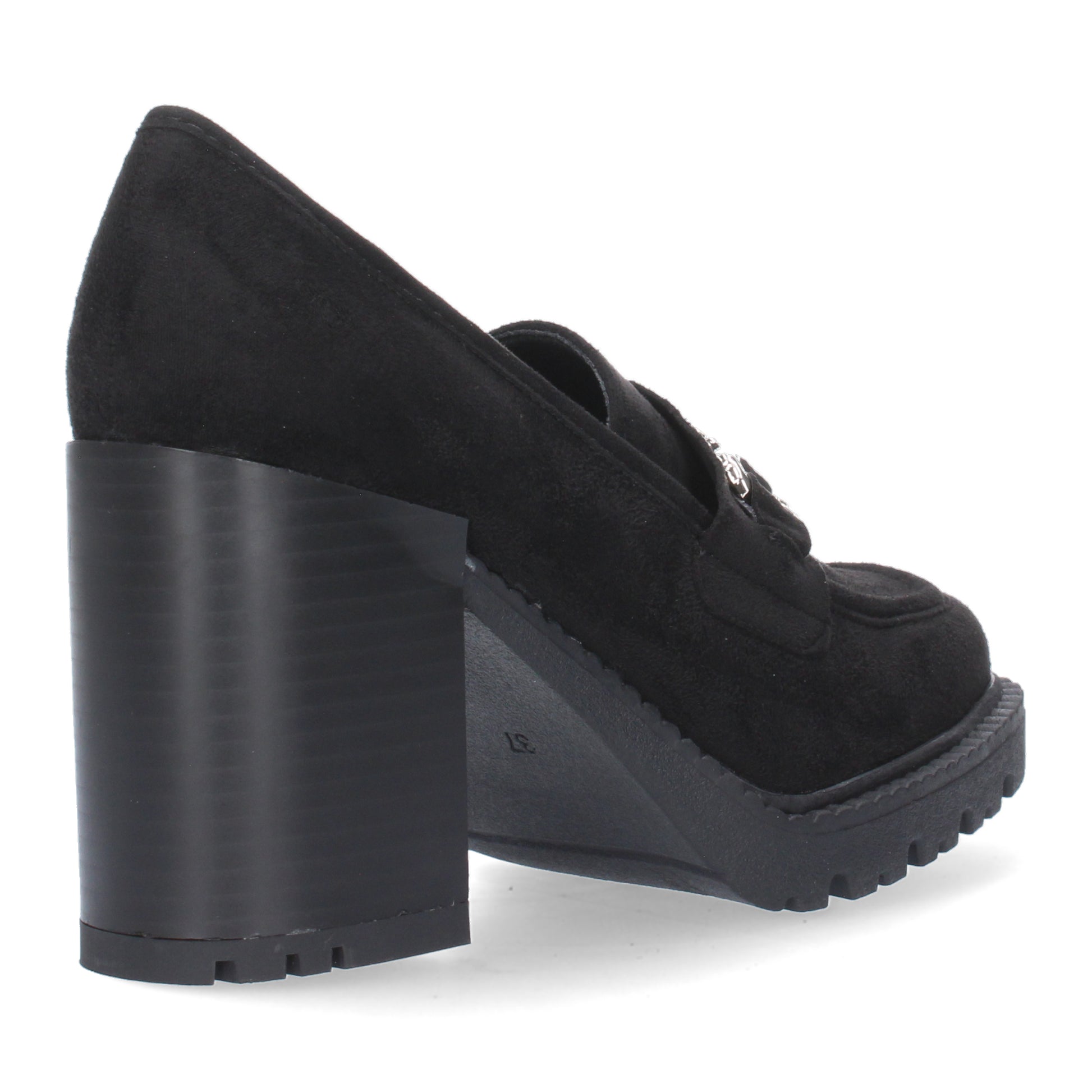 Mocasin de tacon para mujer con adorno metalico en la pala y material aterciopelado.