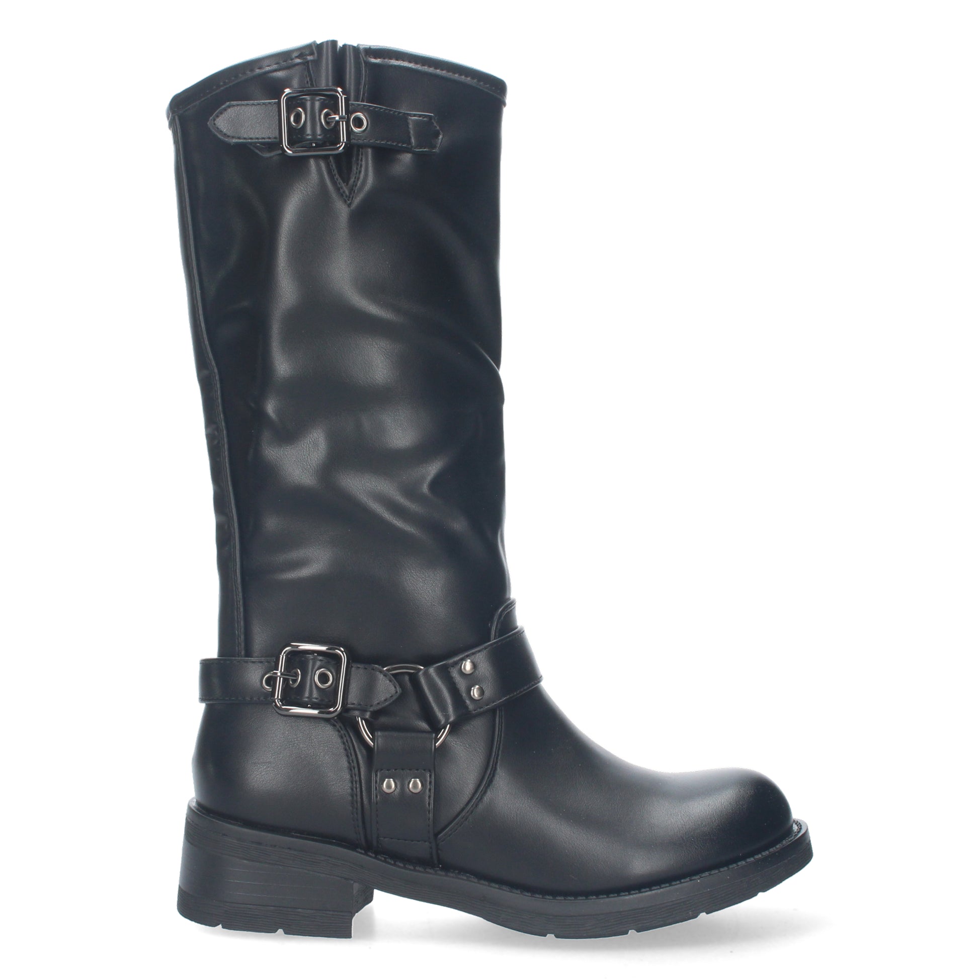 Bota de tacon para mujer con detalle en la caña y cierre de hebilla y de cremallera.