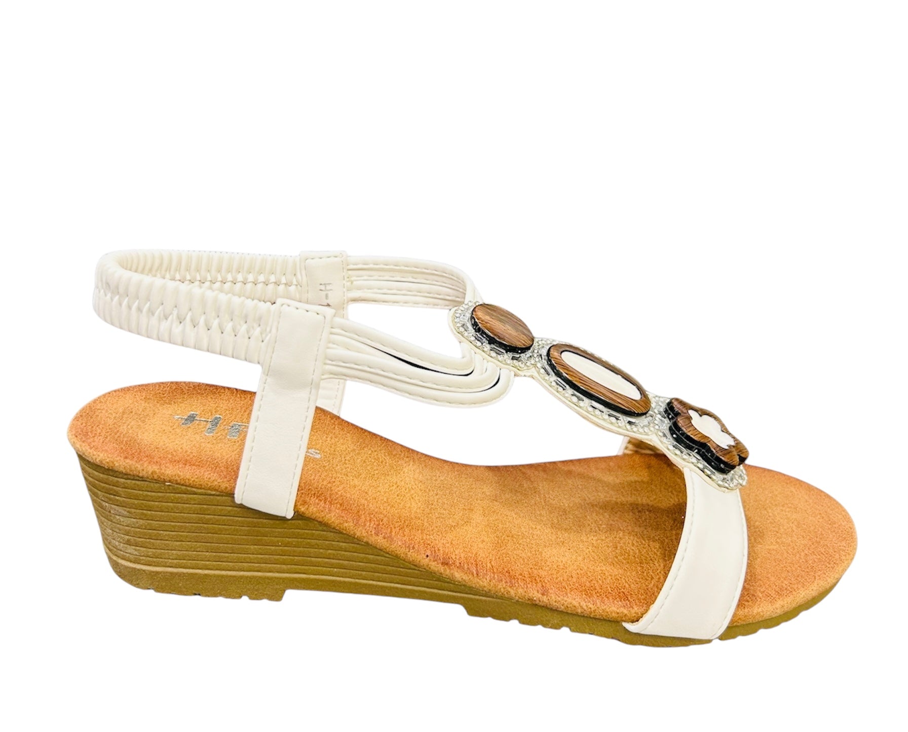 SANDALIA CON CUÑA CON PLANTILLA MUY COMODA Y BLANDITA, CON GOMA ELASTICA ATRAS DISPONIBLE EN COLOR BLANCO