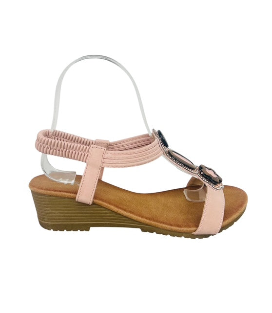 SANDALIA CON CUÑA CON PLANTILLA MUY COMODA Y BLANDITA, CON GOMA ELASTICA ATRAS DISPONIBLE EN COLOR ROSA