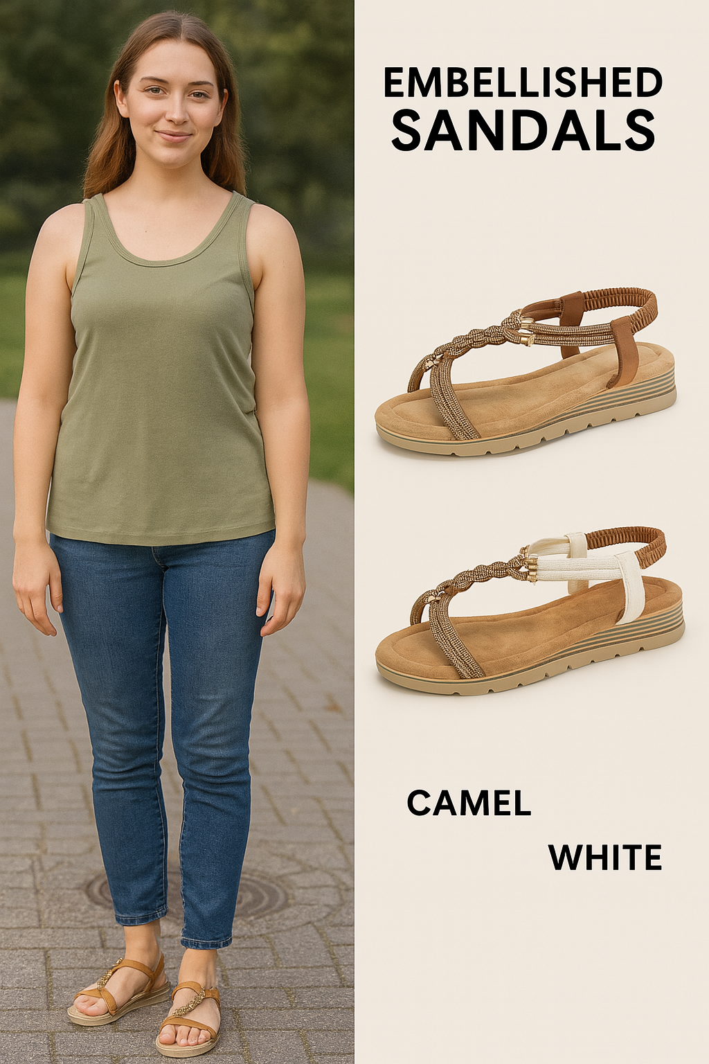 Comodidad y elegancia en un solo diseño. Esta sandalia plana destaca por su suave plantilla acolchada y tiras decoradas con pedrería brillante que le dan un toque glamuroso. Ideal para looks veraniegos, días de paseo o eventos casuales. Su elástico trasero asegura un ajuste perfecto y fácil de poner.