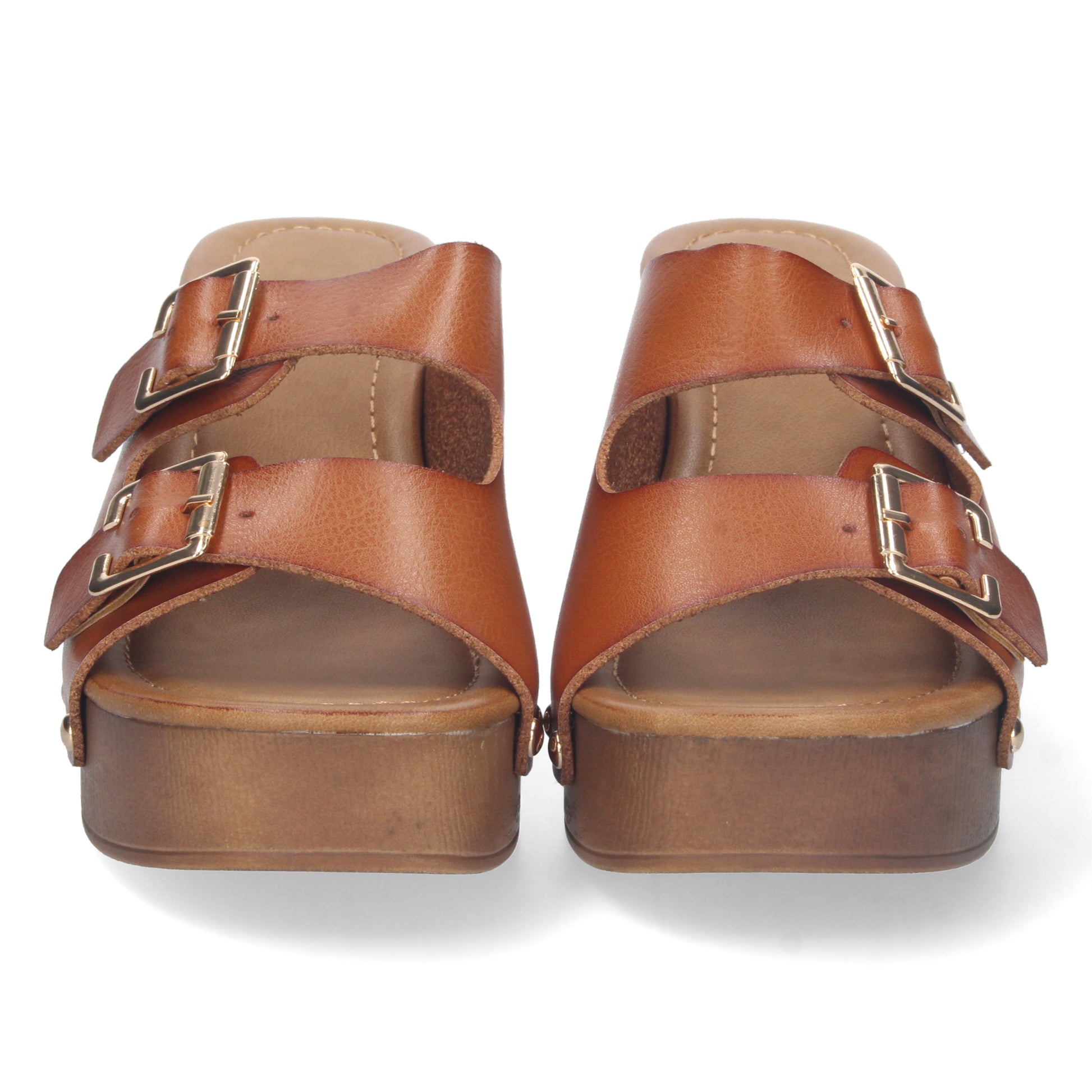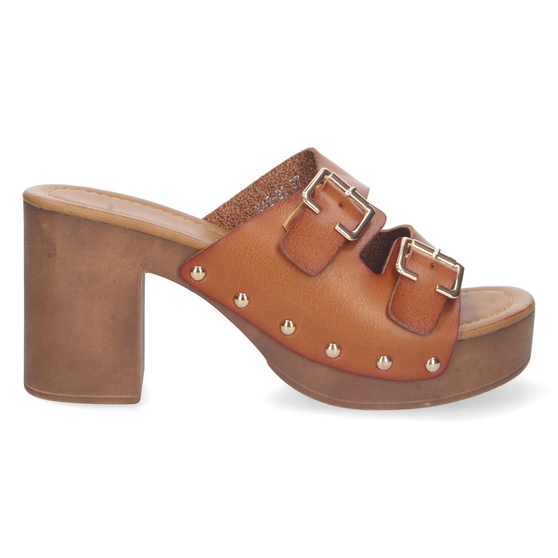 Sandalia de Tacon para Mujer Comodo Material de Imitacion a Madera Palas con Hebillas y Remaches Talon Abierto