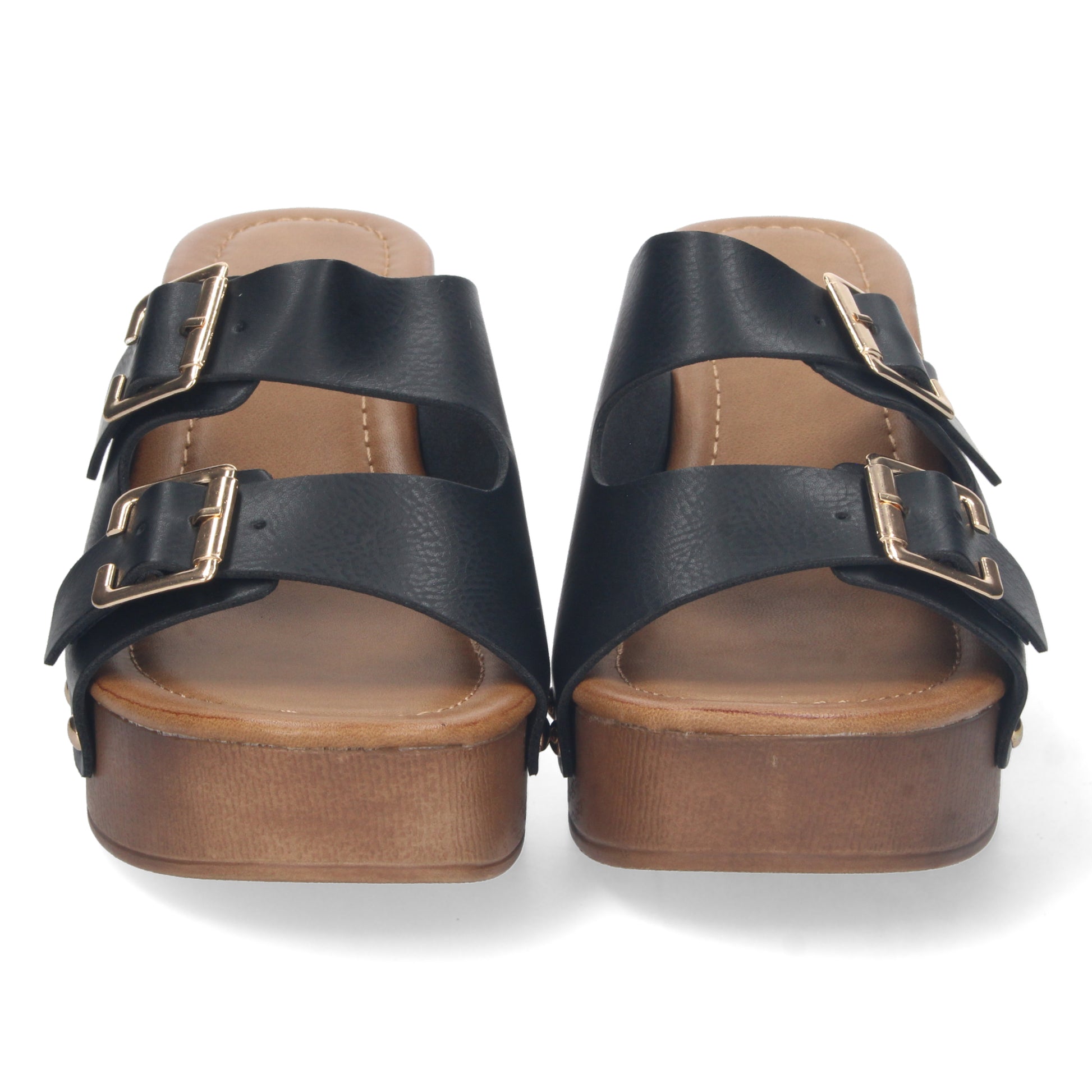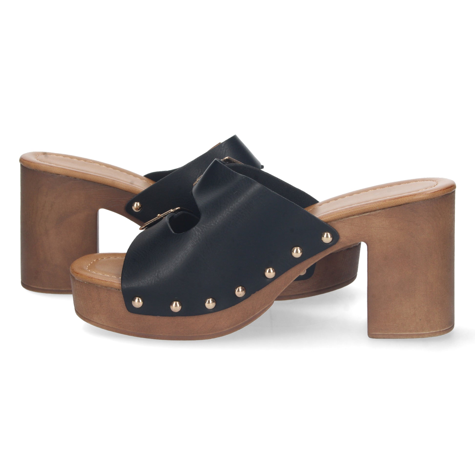Sandalia de Tacon para Mujer Comodo Material de Imitacion a Madera Palas con Hebillas y Remaches Talon Abierto