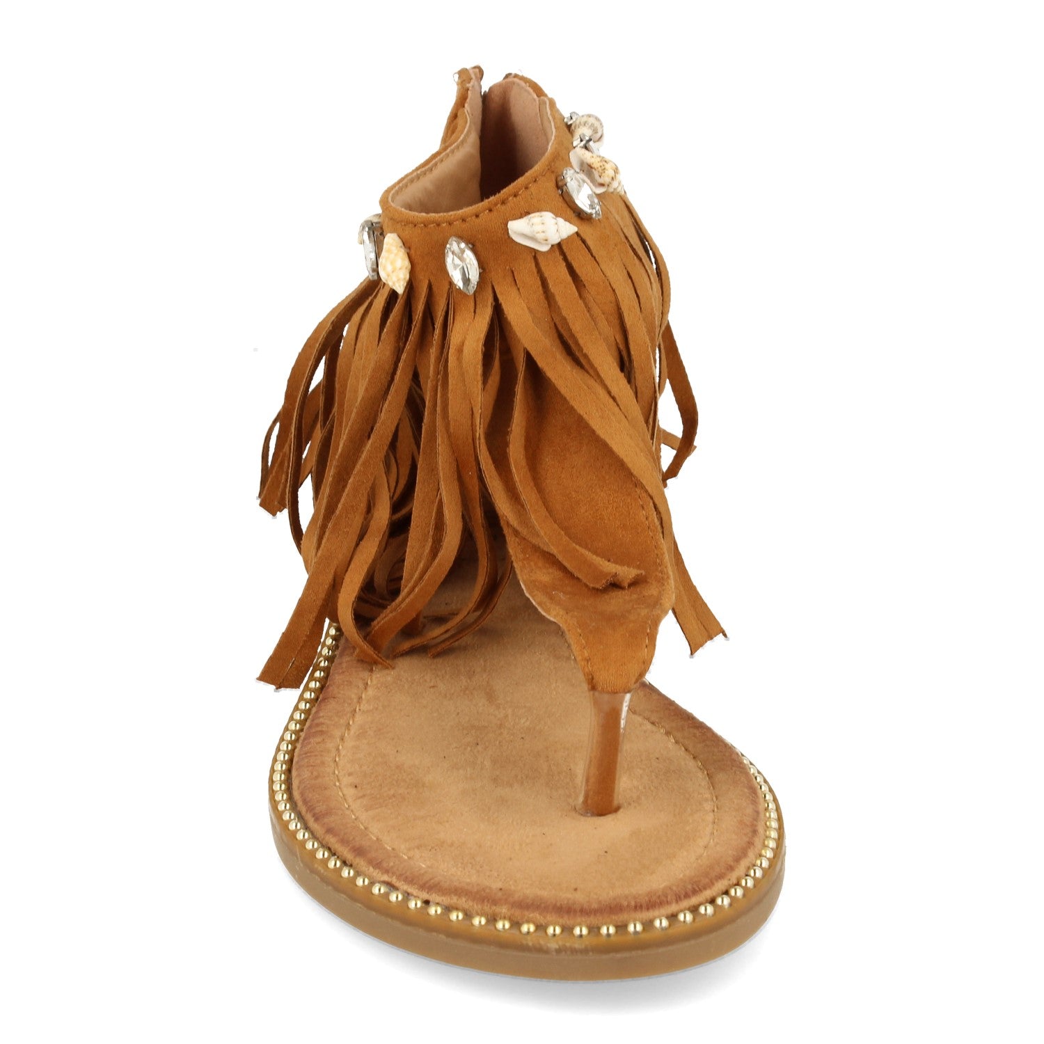 Sandalia Plana de Esclava con Talón Cubierto Flecos Adorno de Conchas Marinas Tachuelas y Cremallera. Primavera Verano 2020.