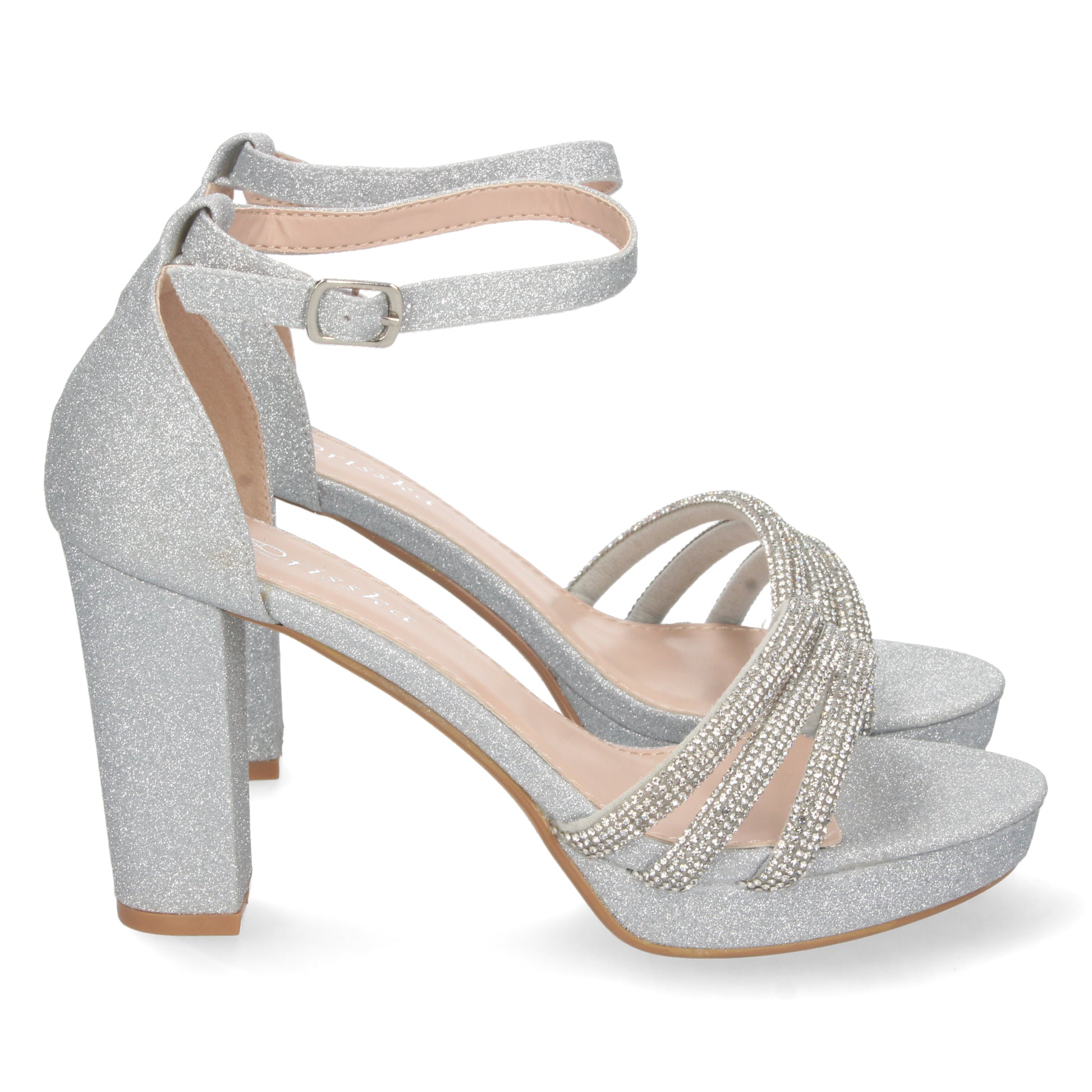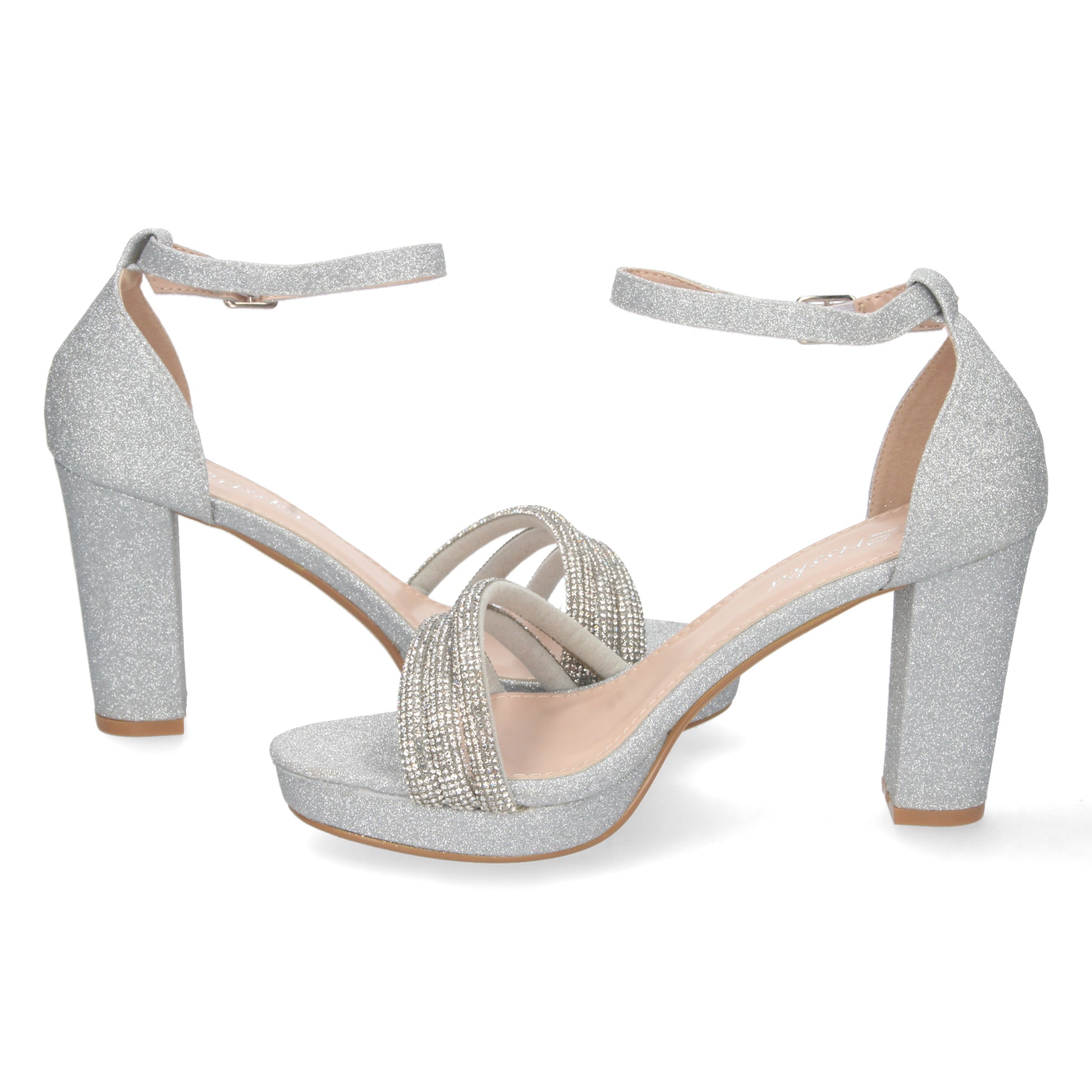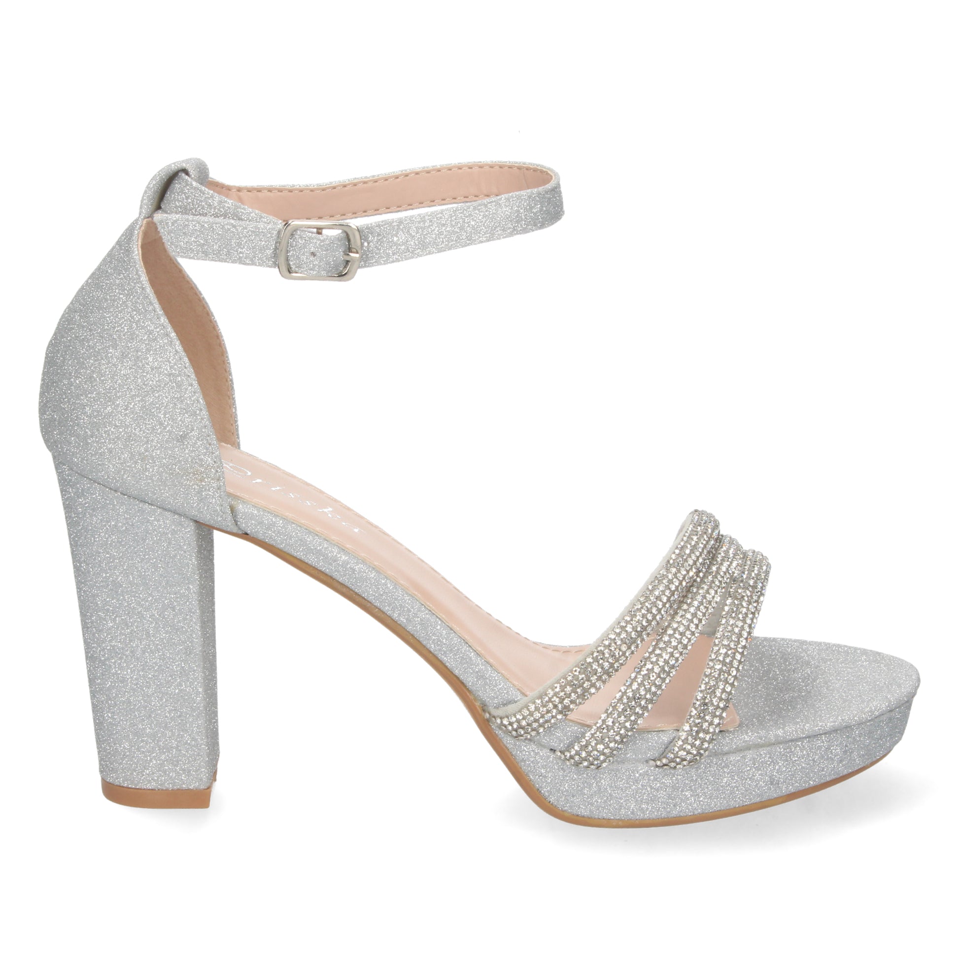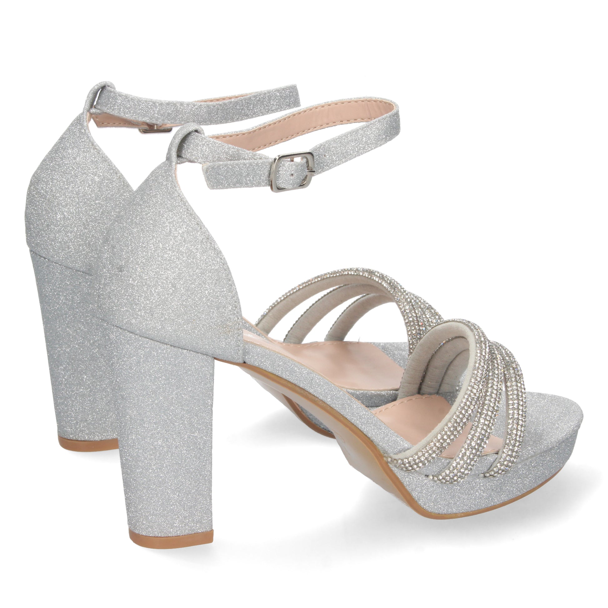 Sandalia de Tacon para Mujer Comoda de Material Brillante Pala con Strass y Cierre de Hebilla Otoño Invierno 2022