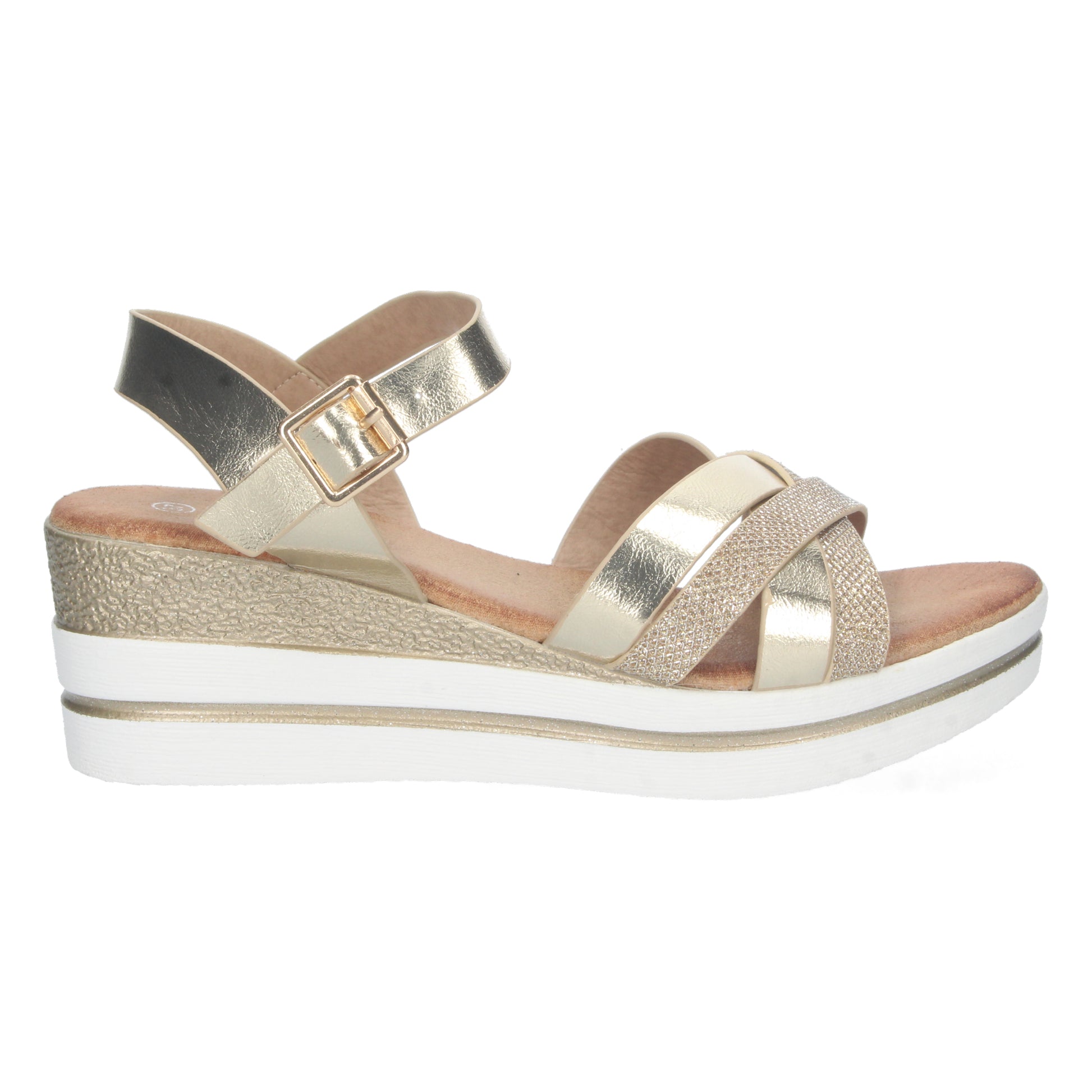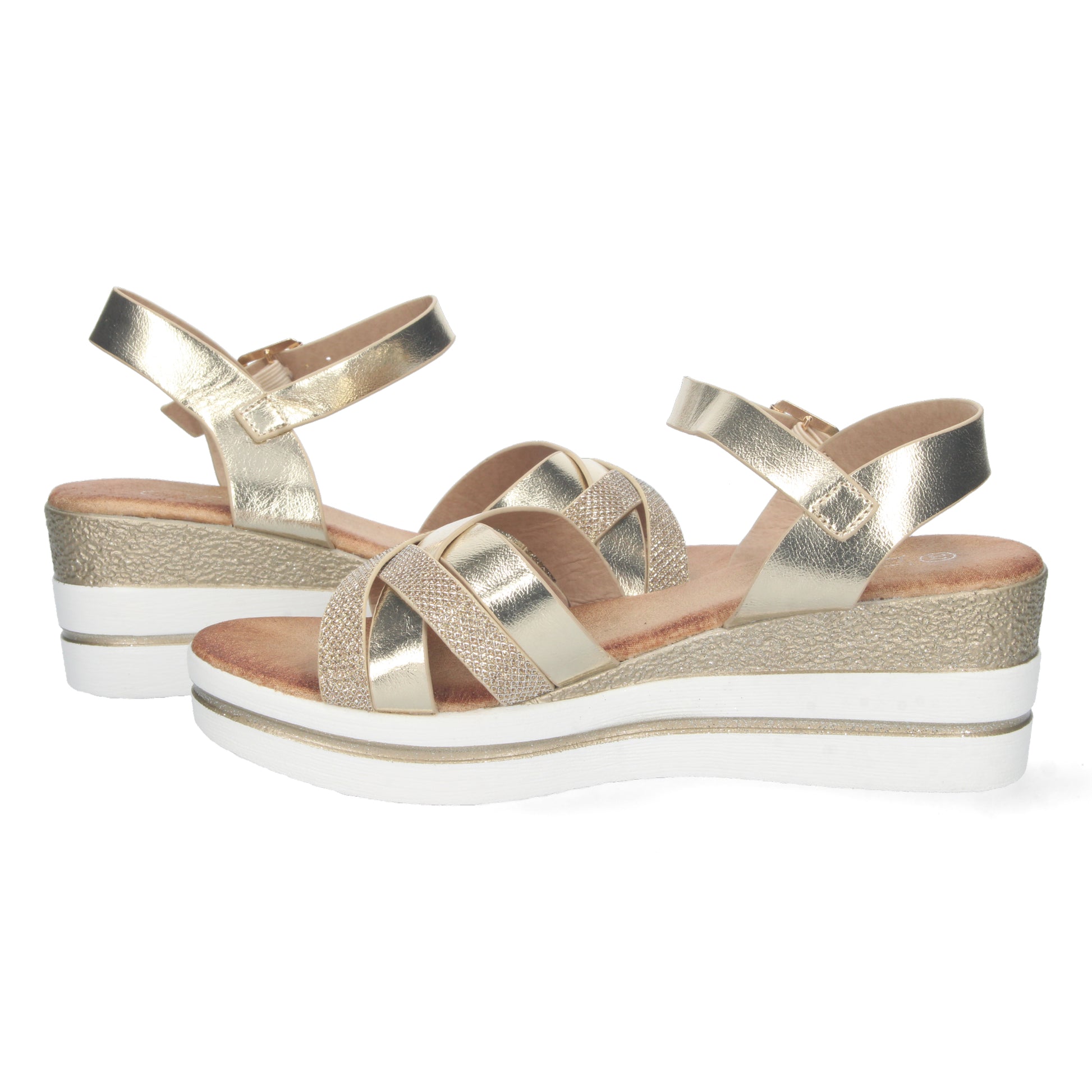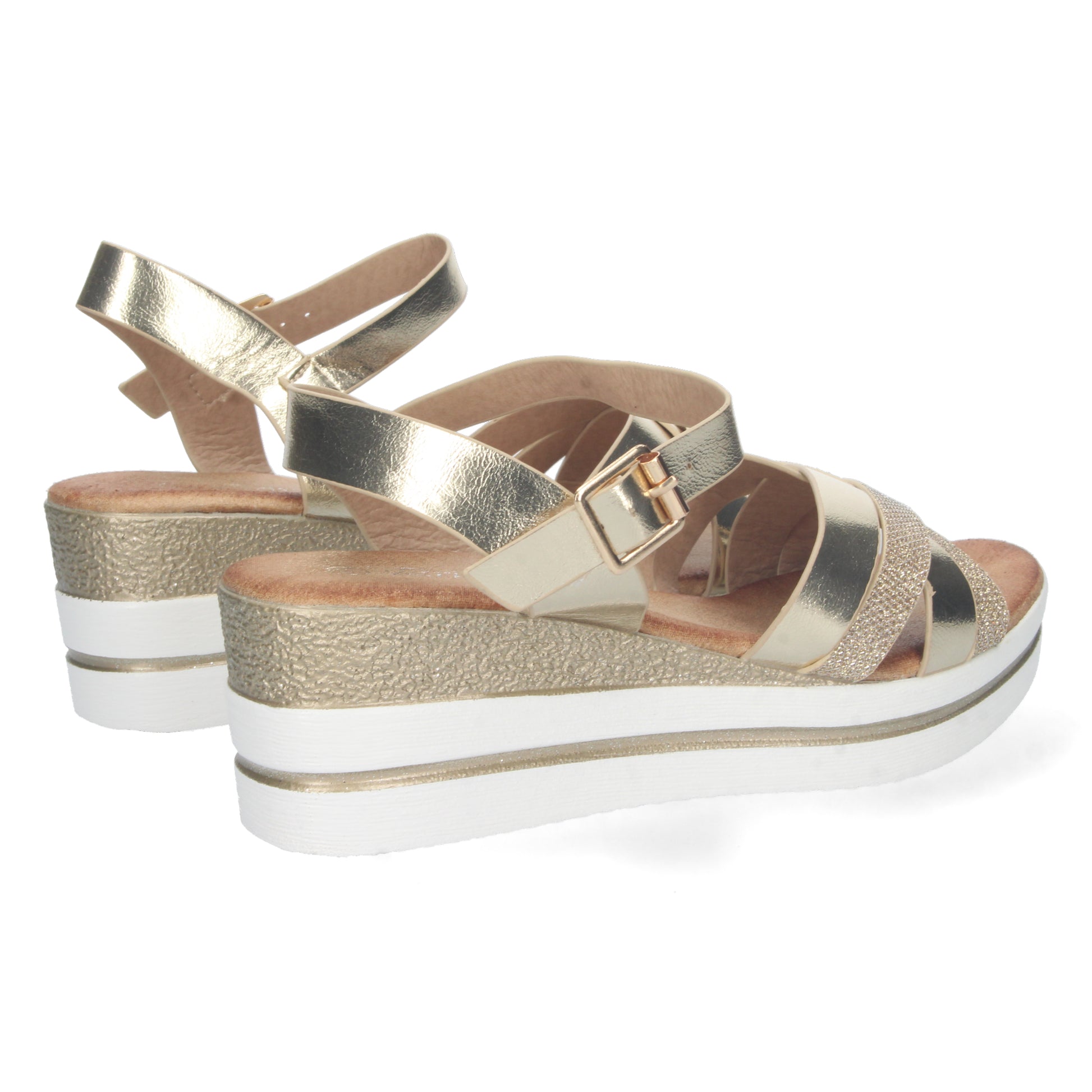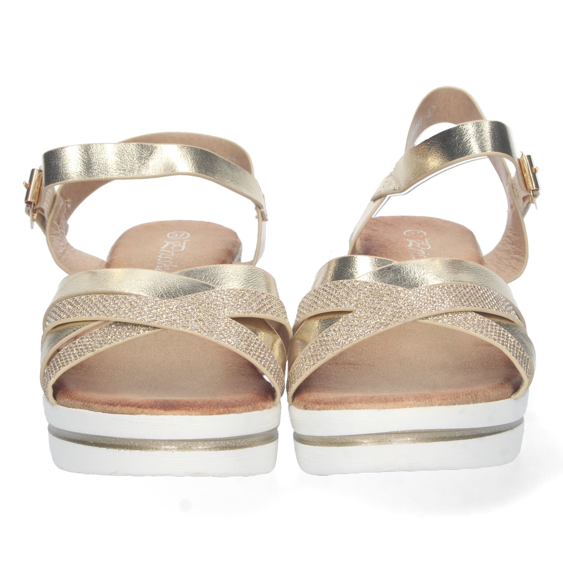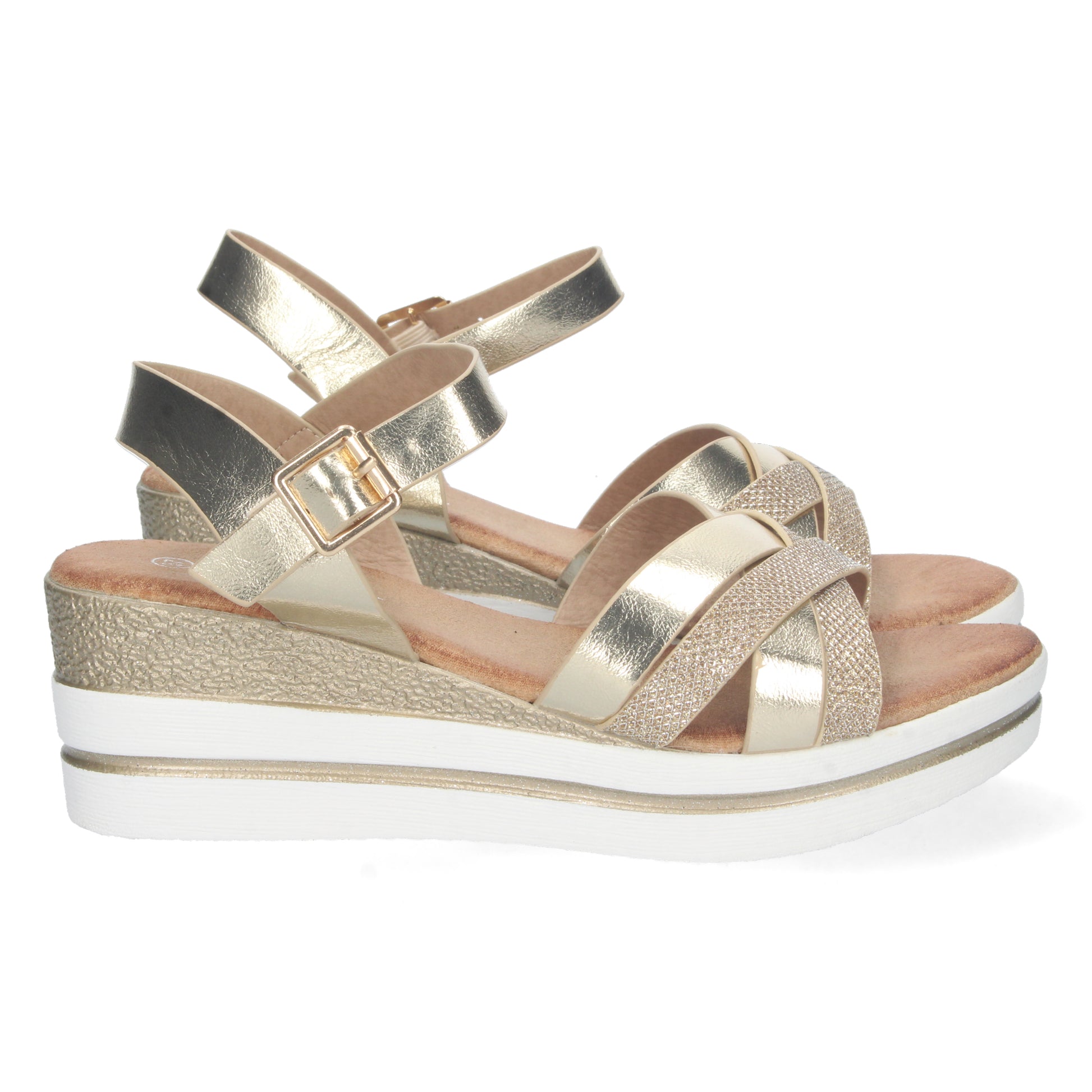 Sandalia de Cuña para Mujer Comoda con Palas Cruzadas Material Brillante y Cierre de Hebilla