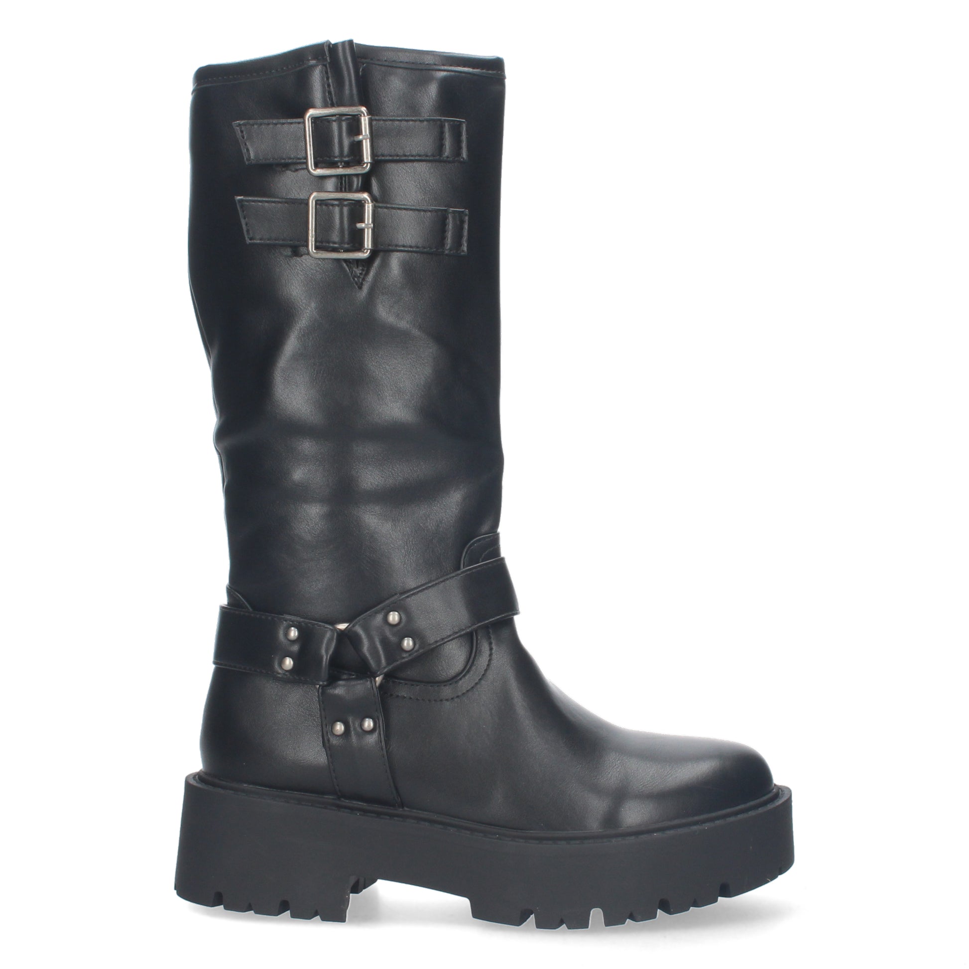 Botas Moteras de Diseño Liso con Tacon Bajo y Plataforma Adorno al Tono en el Tobillo y Caña de 30 5cm con 2 Hebillas y Cierre de Cremallera Ideales para ir de Ruta en Otoño e Invierno