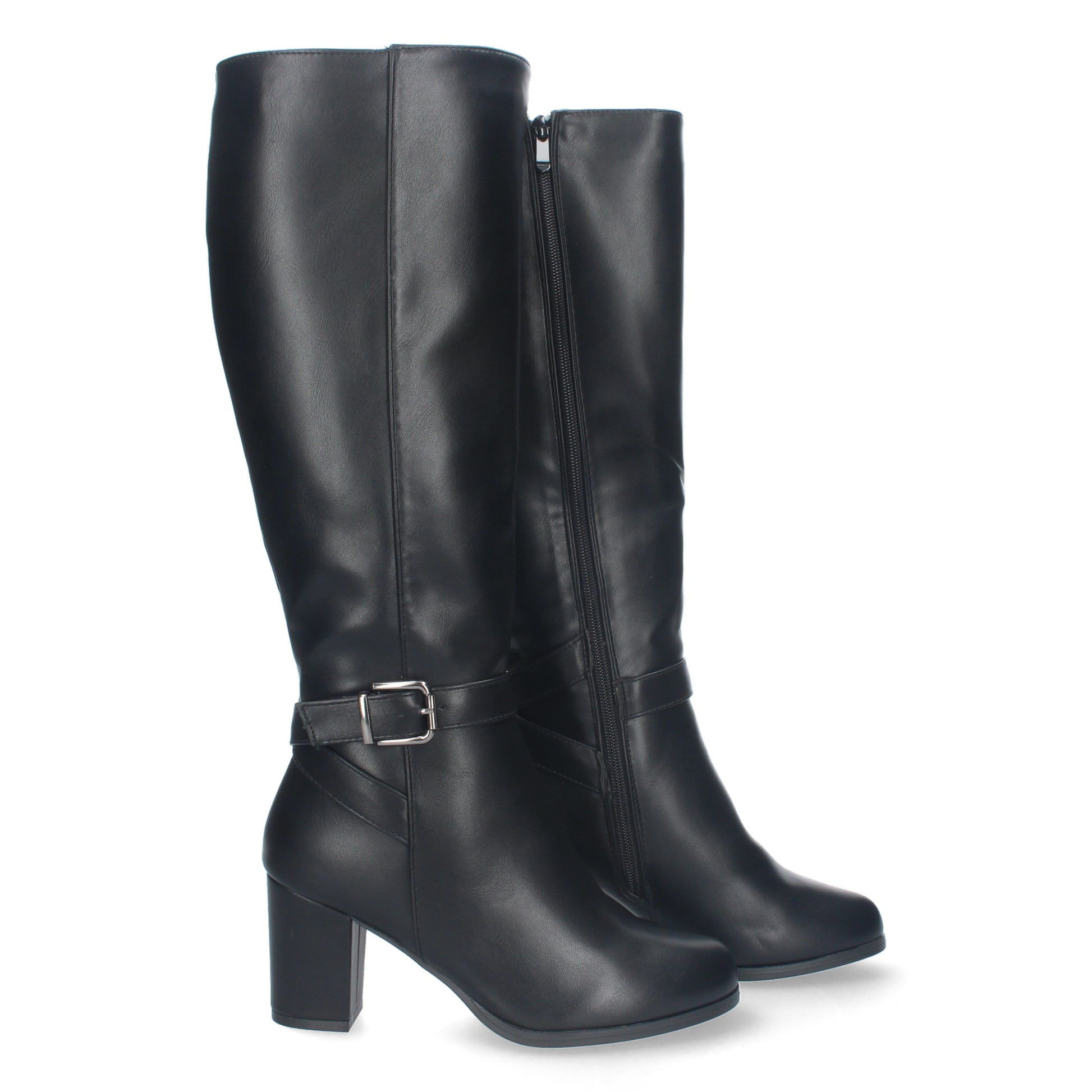 Bota de tacon para mujer punta redonda con cierre de hebilla y cierre de cremallera.