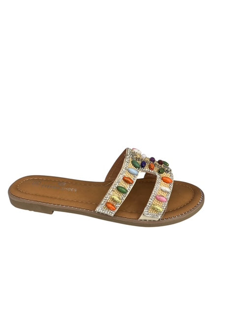 Sandalia plana con detalles de pedrería multicolor que le dan un toque divertido y único a tu estilo. Ideal para los días soleados, combina comodidad y frescura con un diseño llamativo. Perfecta para usar con shorts, faldas o vestidos. ¡Luce vibrante y cómoda este verano!